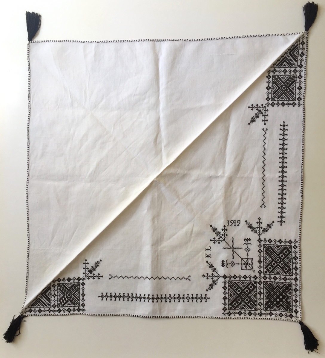 Geometriskt mönster i kvadrater i hörnen, bårder mellan kvadraterna på ryggsnibb och framsnibbar. På ryggsnibben tre kvadrater och en majstångsspira samt märkning med årtal och initialer. På varje framsnibb en kvadrat och en trekant.