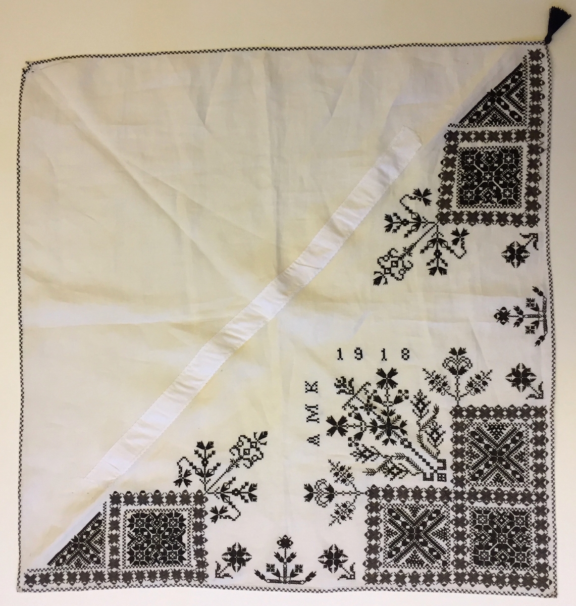 Kvadrater omgivna av blomsterliknande bård. I kvadraterna blomsterliknande geografiskt mönster, rikt dekorerad majstångsspira mellan kvadraterna blomsterliknande motiv.