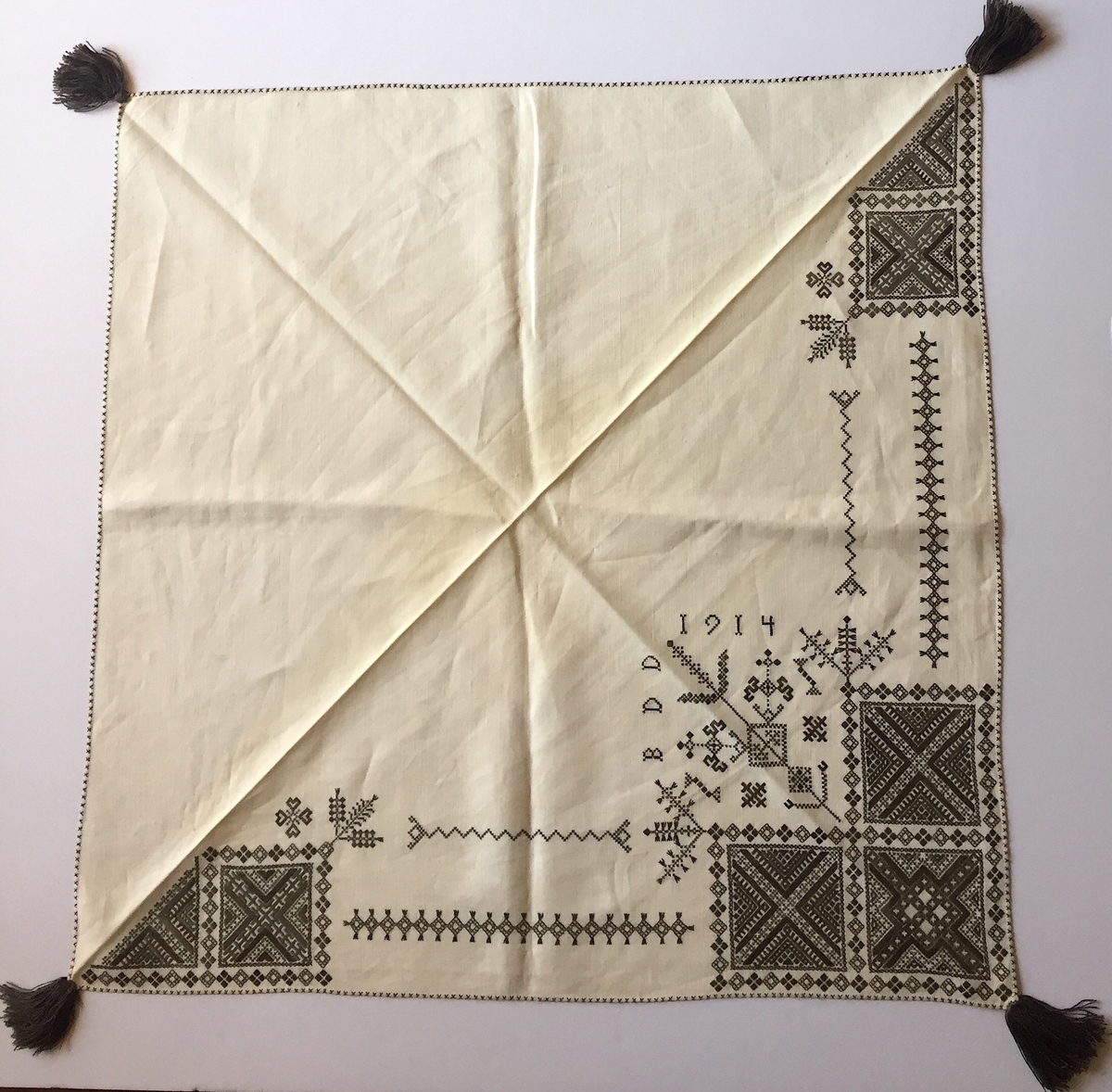 Geometriskt mönster i kvadrater i hörnen, två bårder mellan kvadraterna på ryggsnibb och framsnibbar. På ryggsnibben tre kvadrater och en majstångspira samt märkning med årtal och initialer. På varje framsnibb en kvadrat och en trekant. Sex ornament.