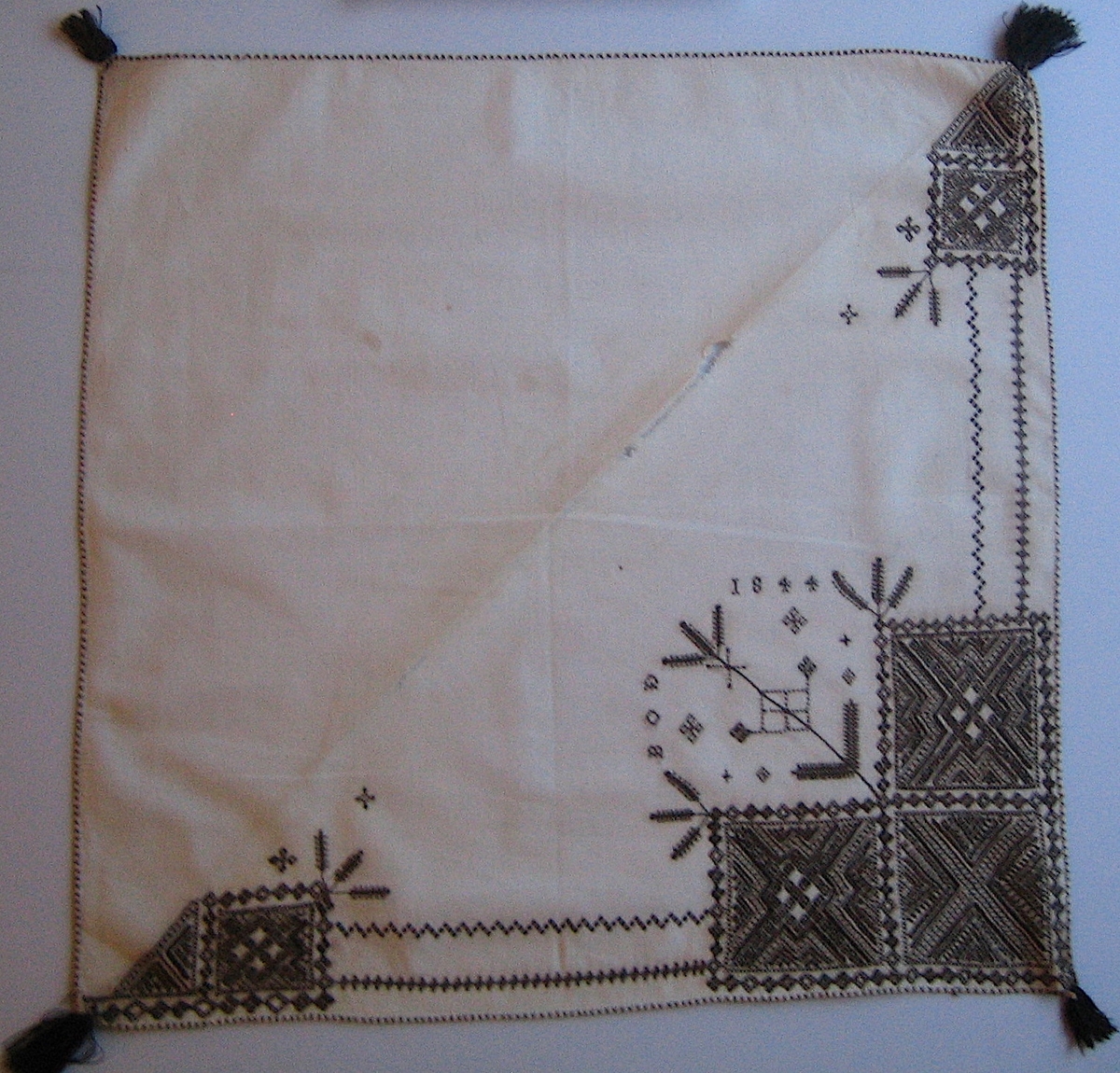 Geometriskt mönster i kvadrater i hörnen. Två bårder mellan kvadraterna på ryggsnibb och framsnibbar. På ryggsnibben tre kvadrater och en majstångsspira samt märkning med årtal och initialer. På varje framsnibb en kvadrat och en trekant. Tio ornament.