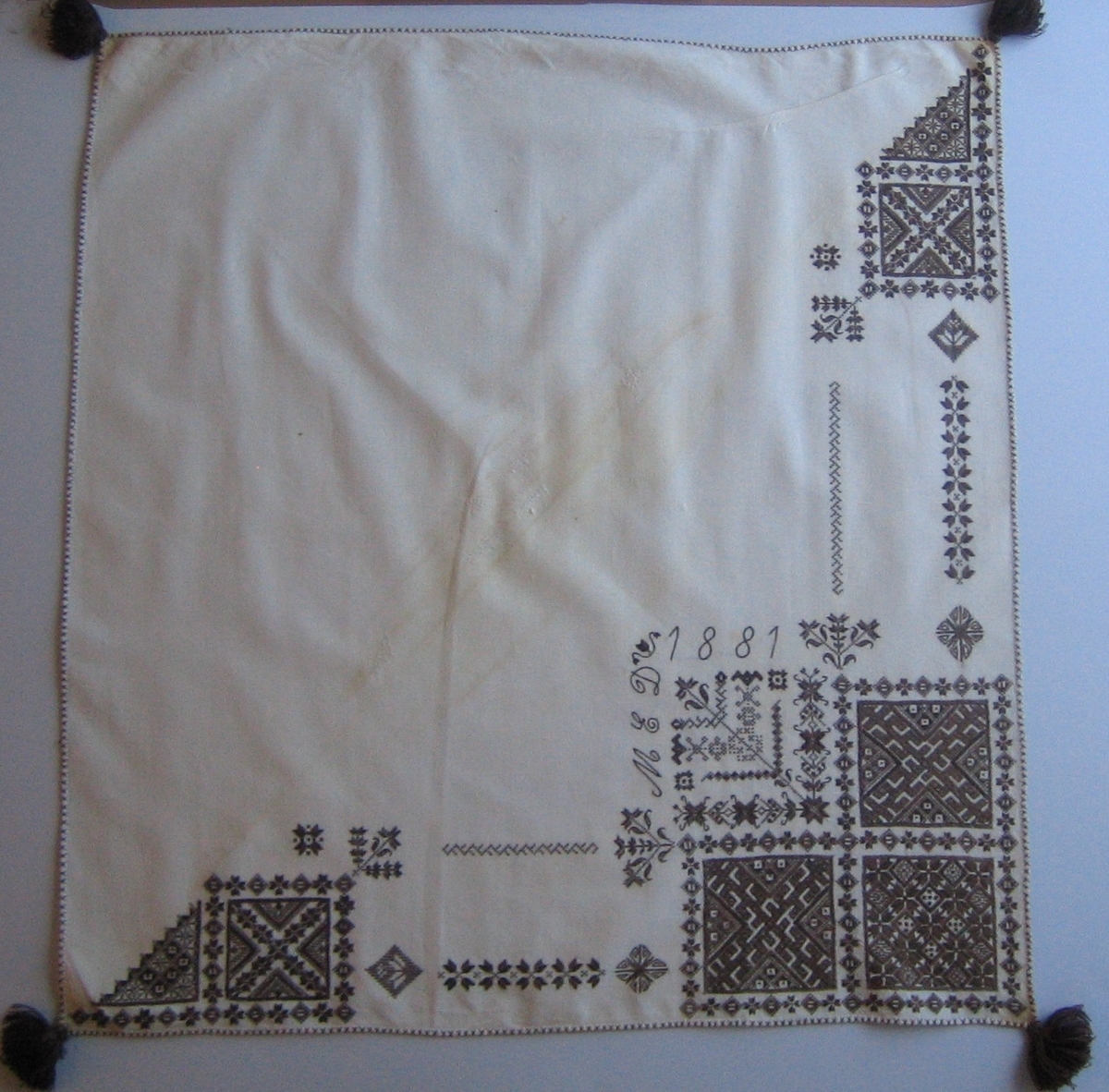 Blomsterinspirerat mönster i kvadrater i hörnen. Runt kvadraterna bård i blomstermotiv. Två bårder mellan kvadraterna på ryggsnibb och framsnibbar. På ryggsnibben tre kvadrater och en rikt dekorerad majstångsspira samt märkning med årtal och initialer. På varje framsnibb en kvadrat och en trekant. Nio ornament.