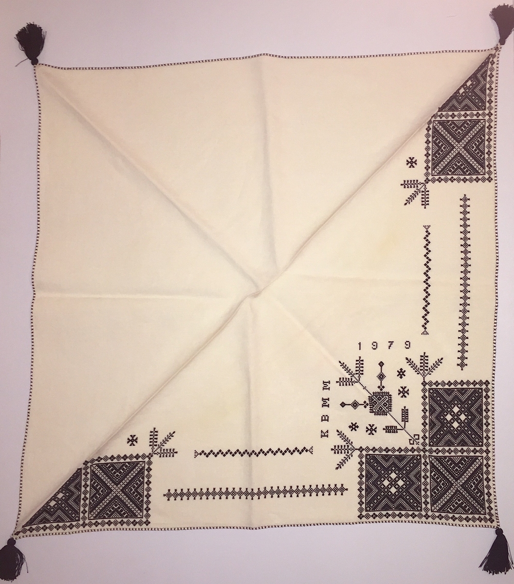 Geometriskt mönster i kvadrater i hörnen. Två bårder mellan kvadraterna på ryggsnibb och framsnibbar. På ryggsnibben tre kvadrater och en majstångsspira samt märkning med årtal och initialer. På varje framsnibb en kvadrat och en trekant. Sex ornament.