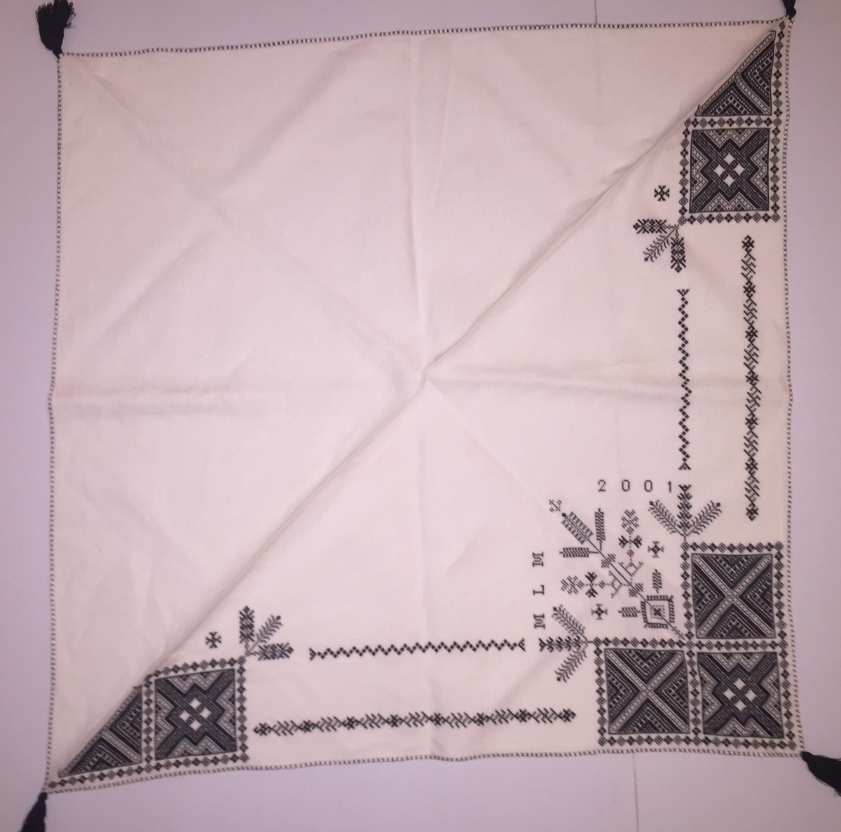 Geometriskt mönster i kvadrater i hörnen. Två bårder mellan kvadraterna på ryggsnibb och framsnibbar. På ryggsnibben tre kvadrater och en majstångsspira samt märkning med årtal och initialer. På varje framsnibb en kvadrat och en trekant. Fyra ortnament.