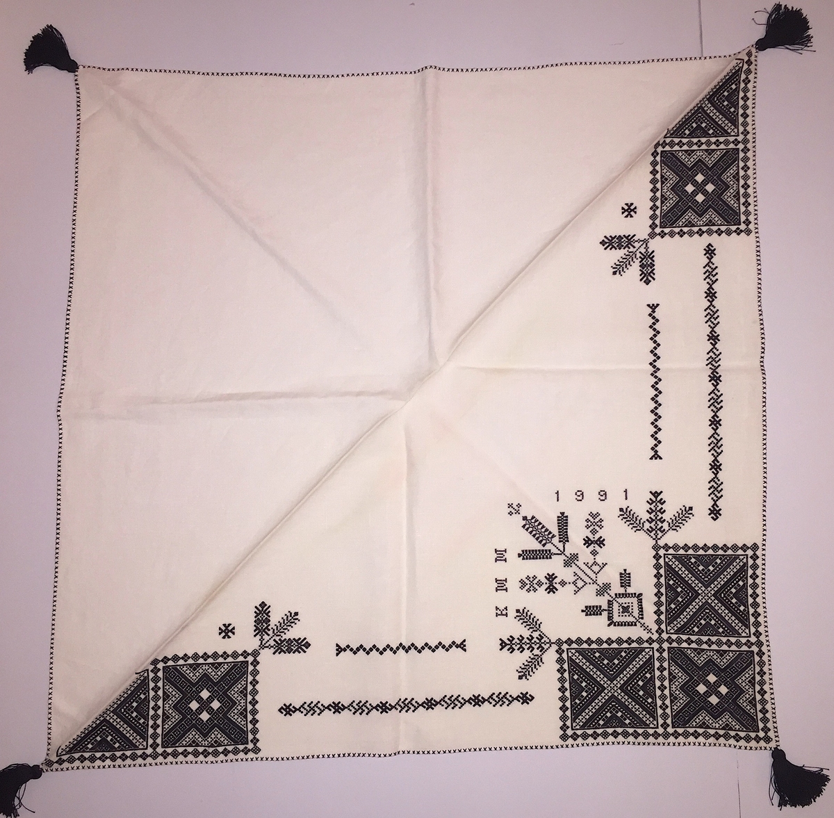 Geometriskt mönster i kvadrater i hörnen. Två bårder mellan kvadraterna på ryggsnibb och framsnibbar. På ryggsnibben tre kvadrater och en majstångsspira samt märkning med årtal och initialer. På varje framsnibb en kvadrat och en trekant. Två ornament.