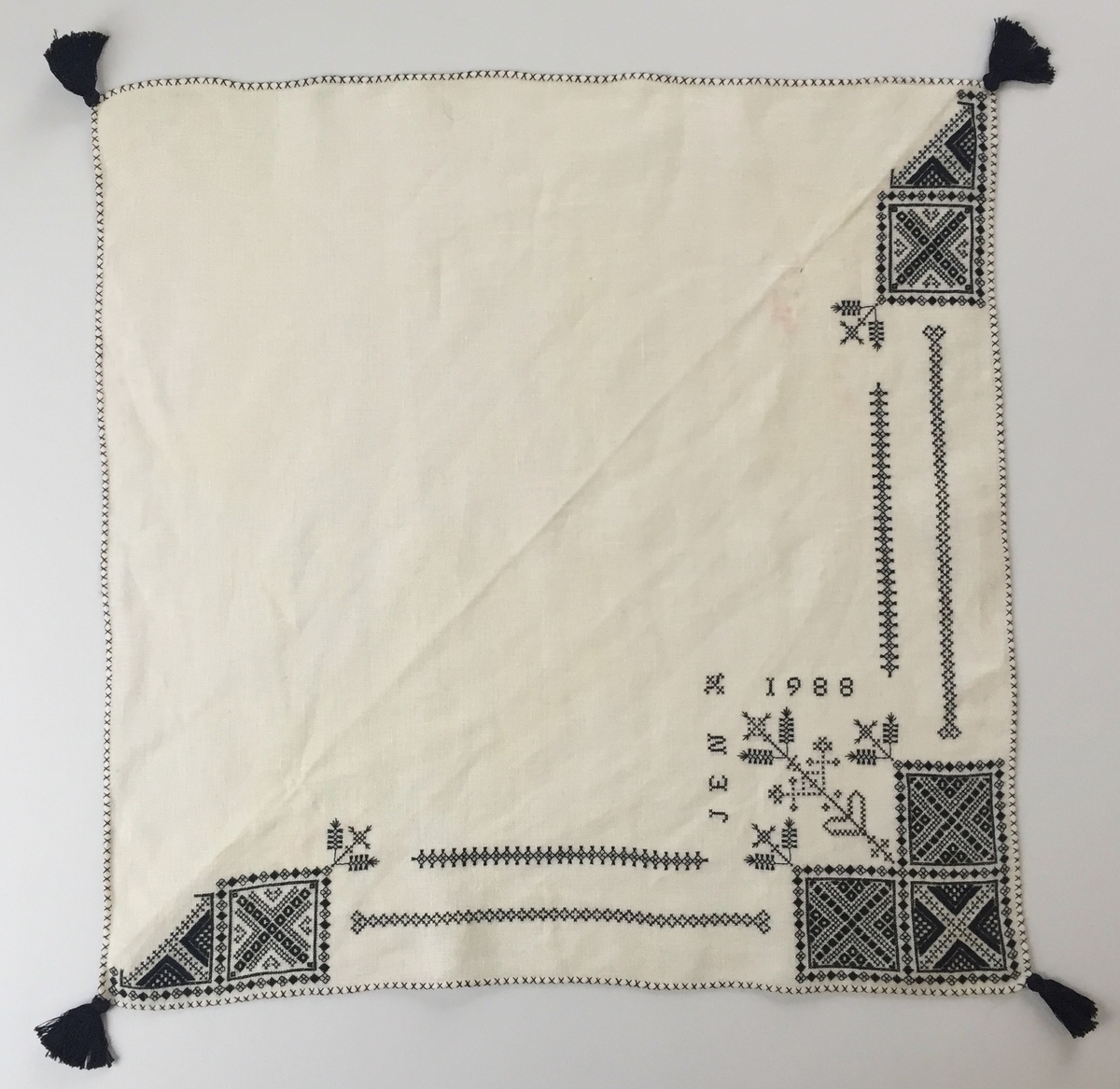 Geometriskt mönster i kvadrater i hörnen. Två bårder mellan kvadraterna på ryggsnibb och framsnibbar. På ryggsnibben tre kvadrater och en majstångsspira samt märkning med årtal och initialer. På varje framsnibb en kvadrat och en trekant. Ett ornament.