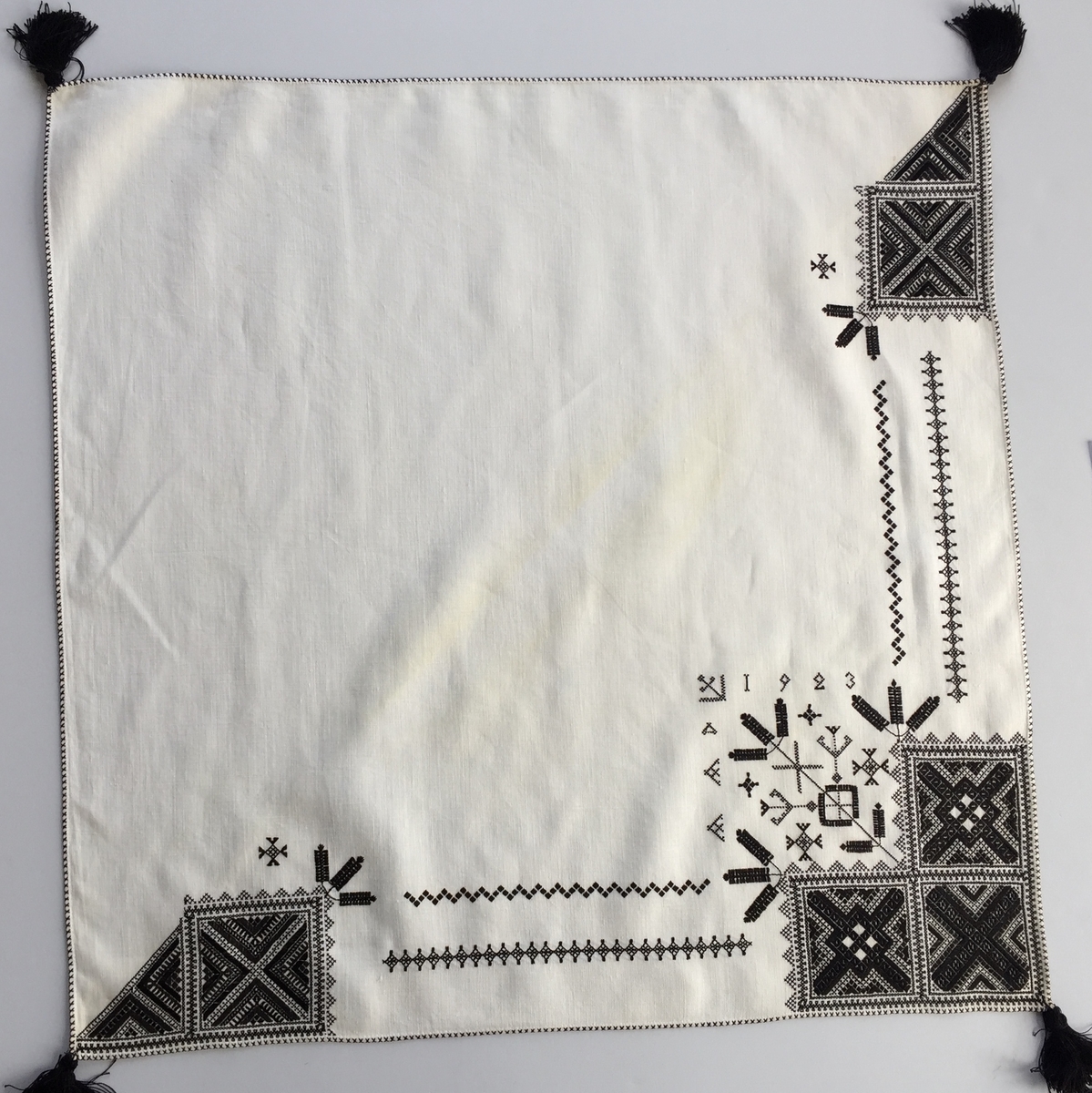 Geometriskt mönster i kvadrater i hörnen. Två bårder mellan kvadraterna på ryggsnibb och framsnibbar. På ryggsnibben tre kvadrater och en majstångsspira samt märkning med årtal och initialer. På varje framsnibb en kvadrat och en trekant. Sju ornament.