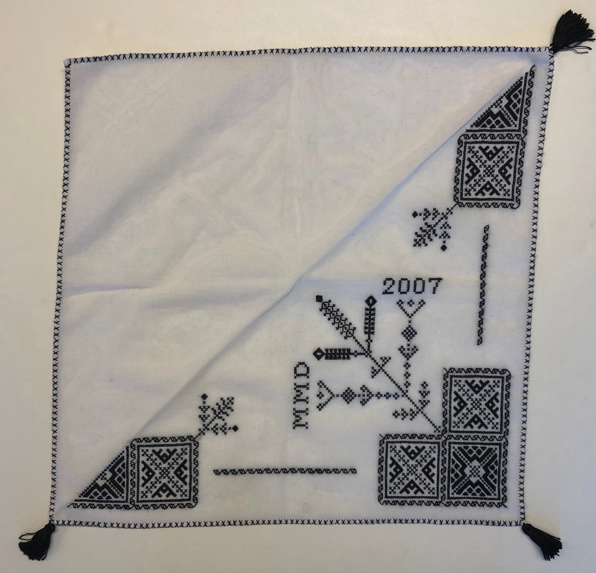 Titel: Geometriskt mönster i kvadrater i hörnen. En bård mellan kvadraterna på ryggsnibb och framsnibbar. På ryggsnibben tre kvadrater och en majstångsspira samt märkning med årtal och initialer. På varje framsnibb en kvadrat och en trekant.