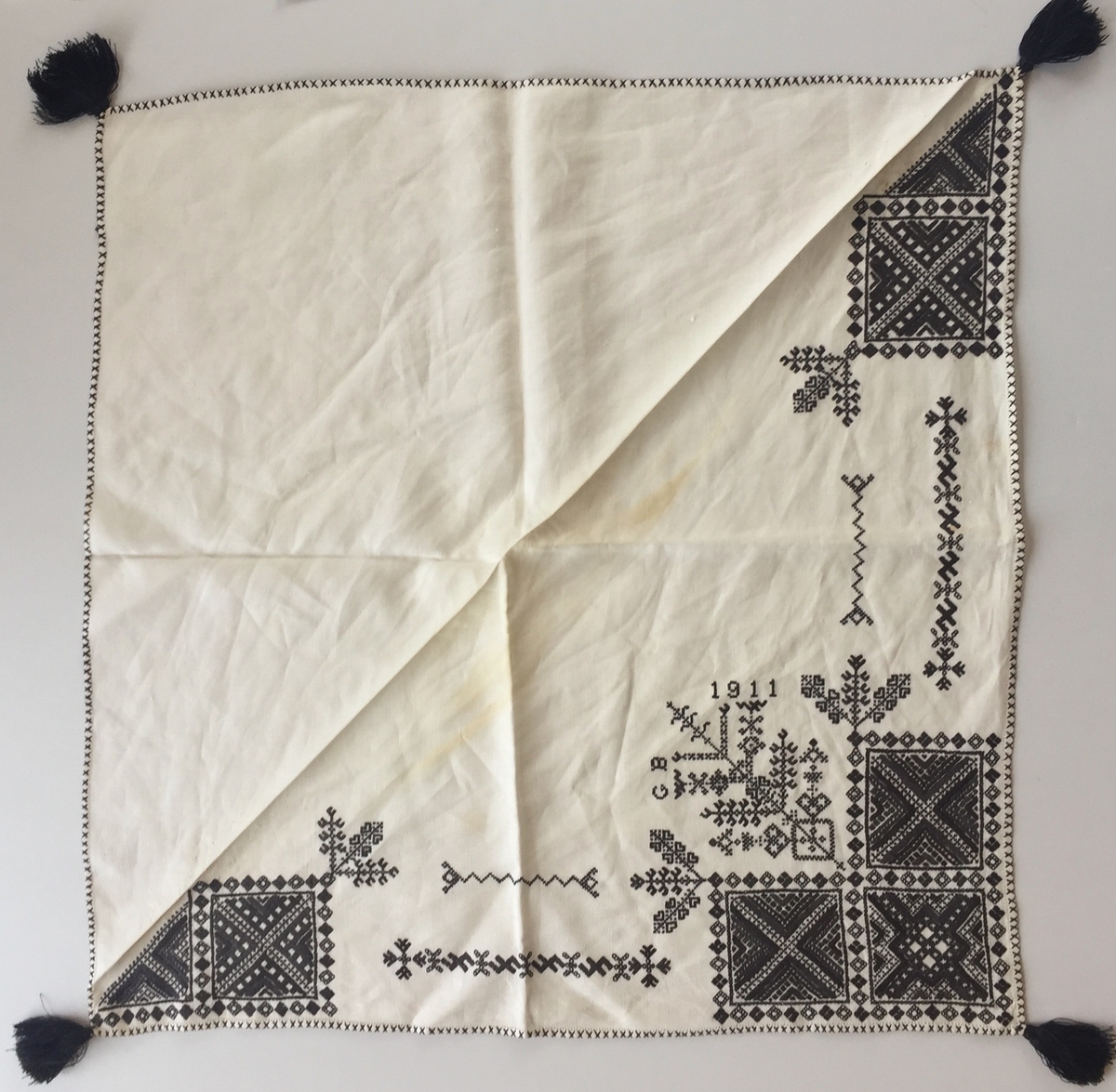 Geometriskt mönster i kvadrater i hörnen huvudsakligen i rätlinjig plattsöm. Två bårder mellan kvadraterna på ryggsnibb och framsnibbar. På ryggsnibben tre kvadrater och en rikt dekorerad majstångsspira samt märkning med årtal och initialer. På varje framsnibb en kvadrat och en trekant.
