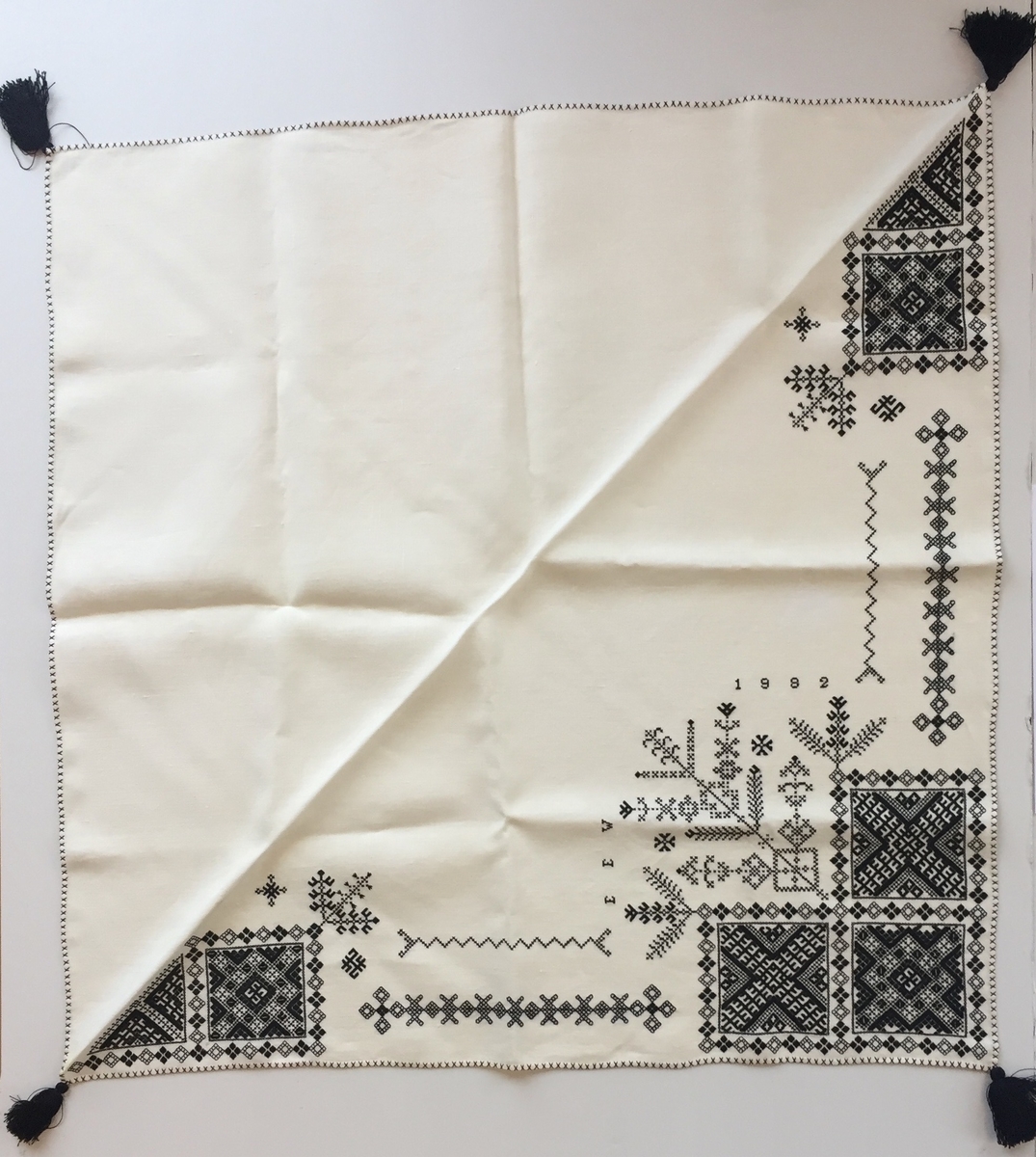 Geometriskt mönster i huvudsak i rätlinjig plattsöm i kvadrater i hörnen. Två bårder mellan kvadraterna på ryggsnibb och framsnibbar. På ryggsnibben tre kvadrater och en majstångsspira samt märkning med årtal och initialer. På varje framsnibb en kvadrat och en trekant. Sex ornament