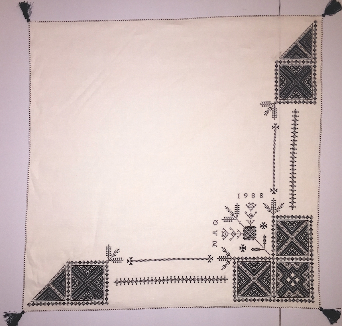 Geometriskt mönster i kvadrater i hörnen. Två bårder mellan kvadraterna på ryggsnibb och framsnibbar. På ryggsnibben tre kvadrater och en majstångsspira samt märkning med årtal och initialer. På varje framsnibb en kvadrat och en trekant. Två ortnament.