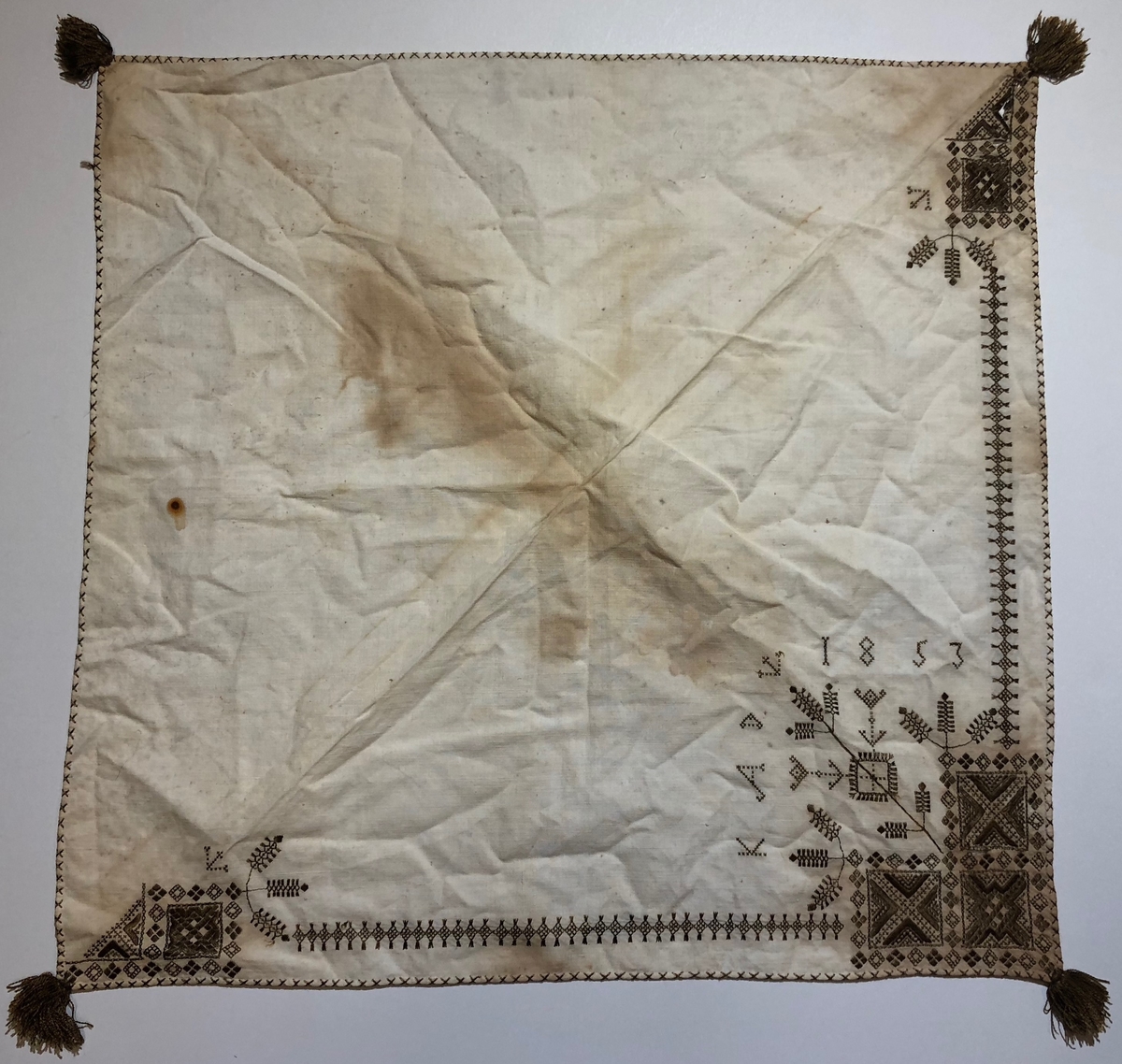 Geometriskt mönster i kvadrater i hörnen. En bård mellan kvadraterna på ryggsnibb och framsnibbar. På ryggsnibben tre kvadrater och en majstångsspira samt märkning med årtal och initialer. På varje framsnibb en kvadrat och en trekant. Tre ornament