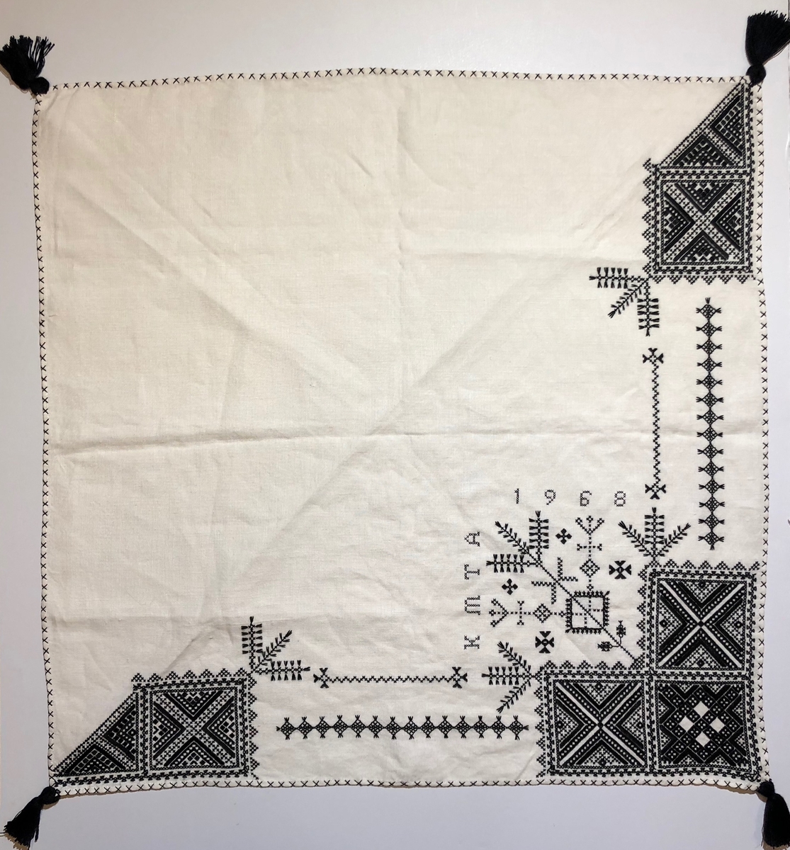 Titel: Geometriskt mönster i kvadrater i hörnen. Två bårder mellan kvadraterna på ryggsnibb och framsnibbar. På ryggsnibben tre kvadrater och en majstångsspira samt märkning med årtal och initialer. På varje framsnibb en kvadrat och en trekant. Fyra ornament