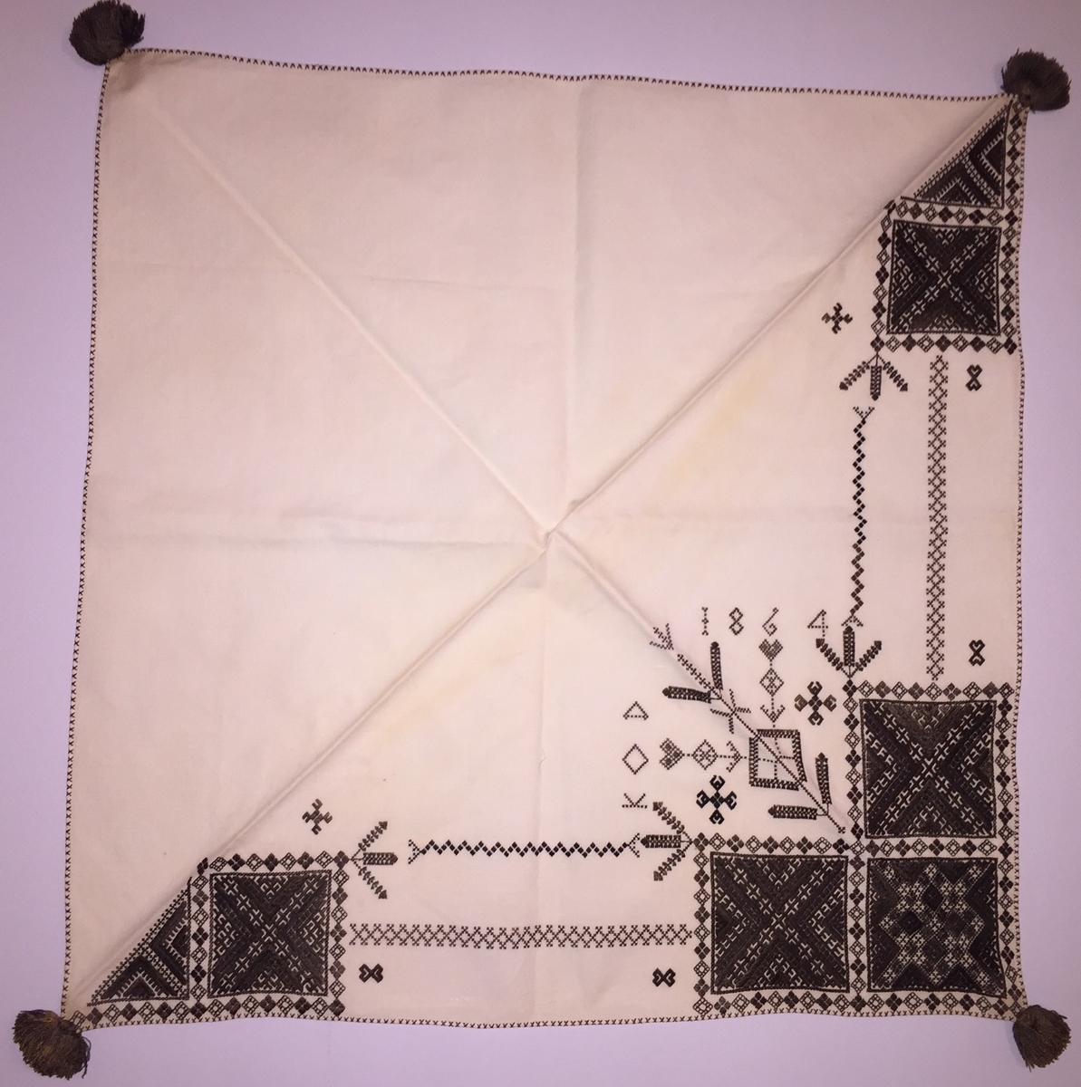 Geometriskt mönster i kvadrater i hörnen huvudsakligen i rätlinjig plattsöm. Två bårder mellan kvadraterna på ryggsnibb och framsnibbar. På ryggsnibben tre kvadrater och en majstångsspira samt märkning med årtal och initialer. På varje framsnibb en kvadrat och en trekant. Åtta