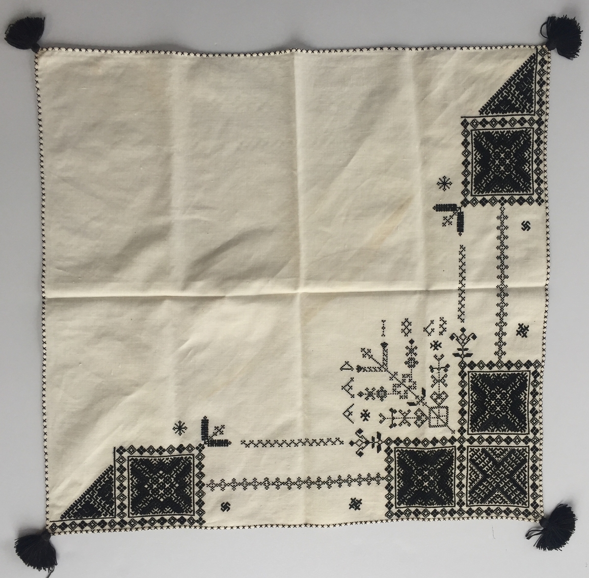 Geometriskt mönster i kvadrater i hörnen, huvudsakligen i rätlinjig plattsöm. Två bårder mellan kvadraterna på ryggsnibb och framsnibbar. På ryggsnibben tre kvadrater och en majstångsspira samt märkning med årtal och initialer. På varje framsnibb en kvadrat och en trekant. Åtta ornament