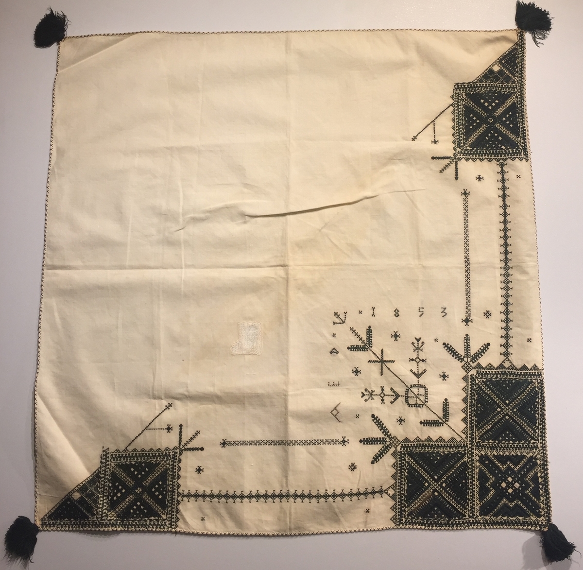 Geometriskt mönster i kvadrater i hörnen. Två bårder mellan kvadraterna på ryggsnibb och framsnibbar. På ryggsnibben tre kvadrater och en majstångsspira samt märkning med