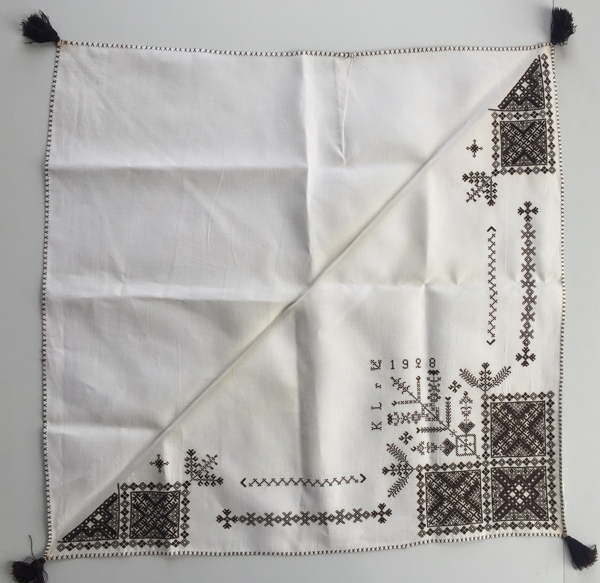 Geometriskt mönster i kvadrater i hörnen huvudsakligen i rätlinjig plattsöm. Två bårder mellan kvadraterna på ryggsnibb och framsnibbar. På ryggsnibben tre kvadrater och en majstångsspira samt märkning med årtal och initialer. På varje framsnibb en kvadrat och en trekant. Fyra ornament.