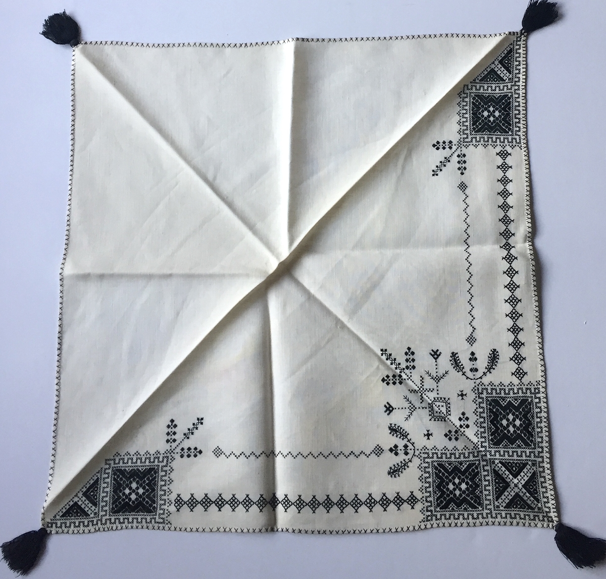 Geometriskt mönster i kvadrater i hörnen, två bårder mellan kvadraterna på ryggsnibb och framsnibbar. På ryggsnibben tre kvadrater och en majstångsspira. På varje framsnibb en kvadrat och en trekant. Två ornament.