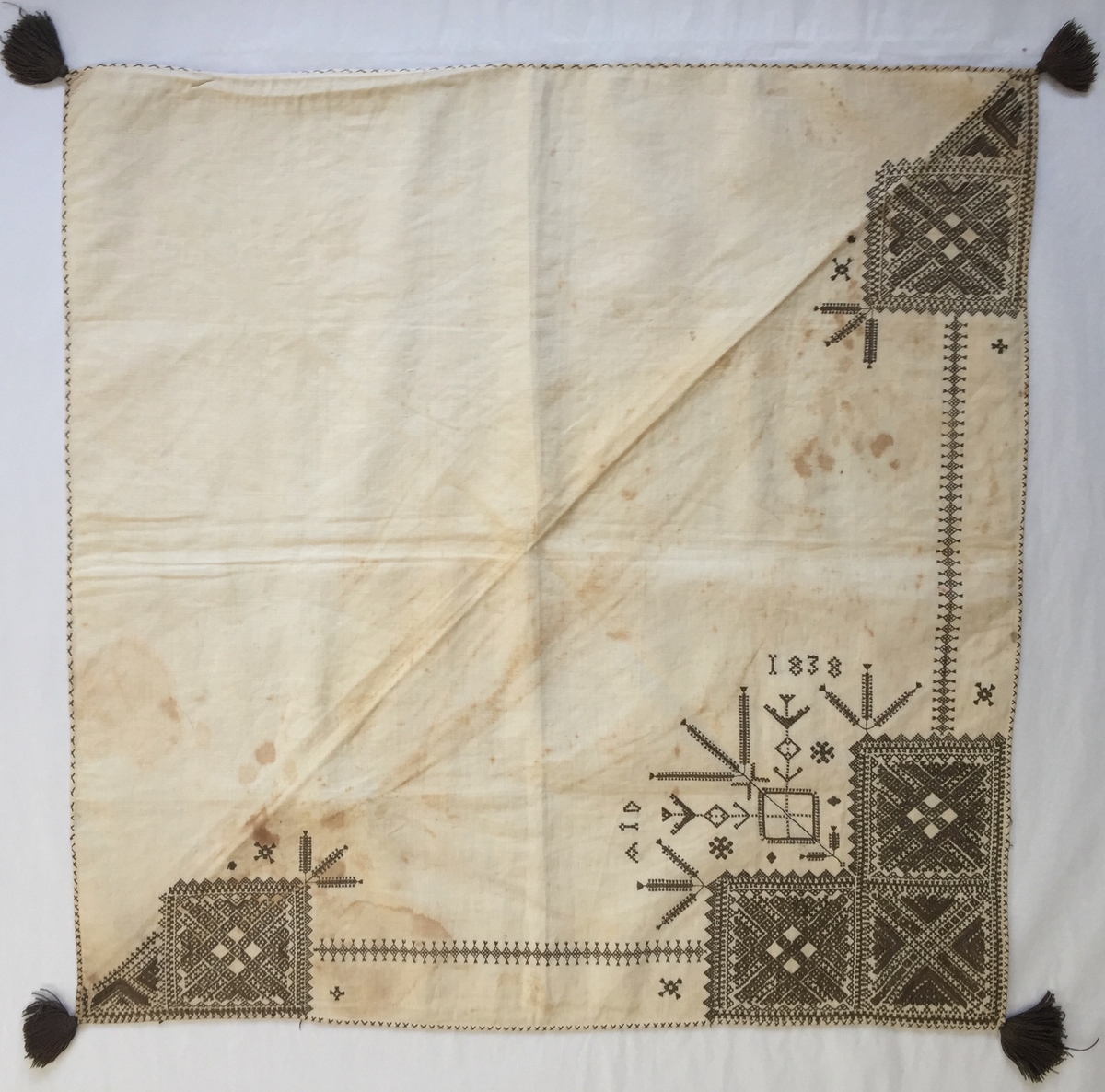 Geometriskt mönster i kvadrater i hörnen, en bård mellan kvadraterna på ryggsnibb och framsnibbar. På ryggsnibben tre kvadrater och en majstångsspira samt märkning med årtal och initialer. På varje framsnibb en kvadrat och en trekant. Tolv ornament.