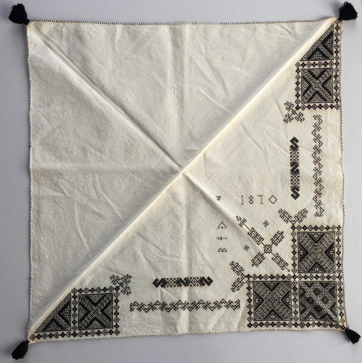 Geometriskt mönster i rätlinjig plattsöm i kvadrater i hörnen. Två bårder mellan kvadraterna på ryggsnibb och framsnibbar. På ryggsnibben tre kvadrater och en enkel majstångsspira samt märkning med årtal och initialer. På varje framsnibb en kvadrat och en trekant. Tre ornament.