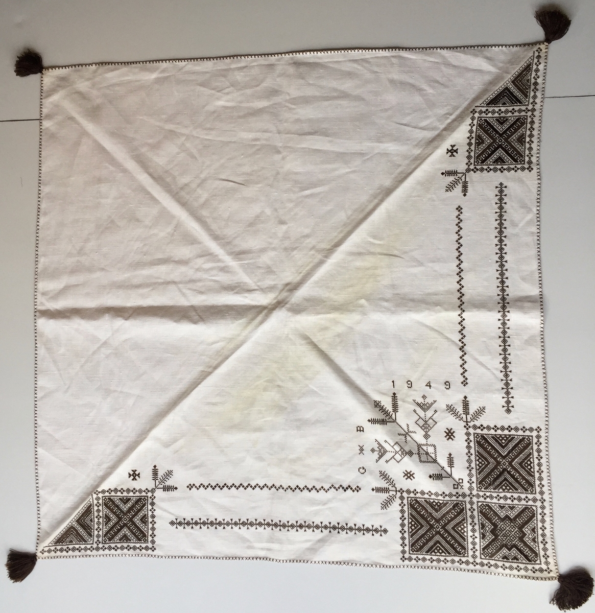Geometriskt mönster i kvadrater i hörnen, två bårder mellan kvadraterna på ryggsnibb och framsnibbar. På ryggsnibben tre kvadrater och en majstångsspira samt märkning med årtal och initialer. På varje framsnibb en kvadrat och en trekant. Två ornament.