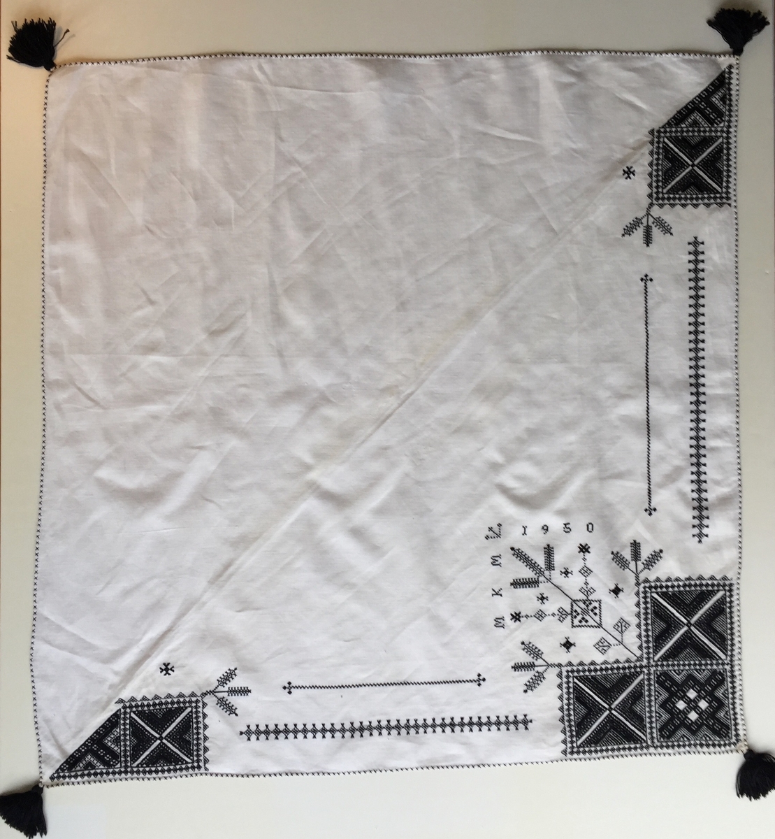 Geometriskt mönster i kvadrater i hörnen, bårder mellan kvadraterna på ryggsnibb och framsnibbar. På ryggsnibben tre kvadrater och en majstångsspira samt märkning med årtal och initialer. På varje framsnibb en kvadrat och en trekant.