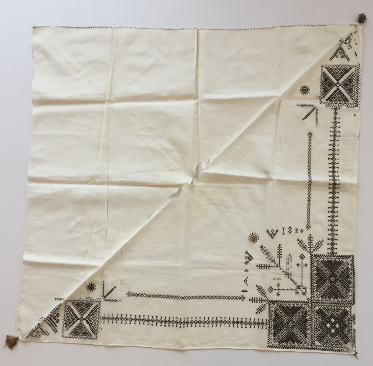 Geometriskt mönster i kvadrater i hörnen. Två bårder mellan kvadraterna på ryggsnibb och framsnibbar. På ryggsnibben tre kvadrater och en majstångsspira samt märkning med årtal och initialer. På varje framsnibb en kvadrat och en trekant Fem ornament