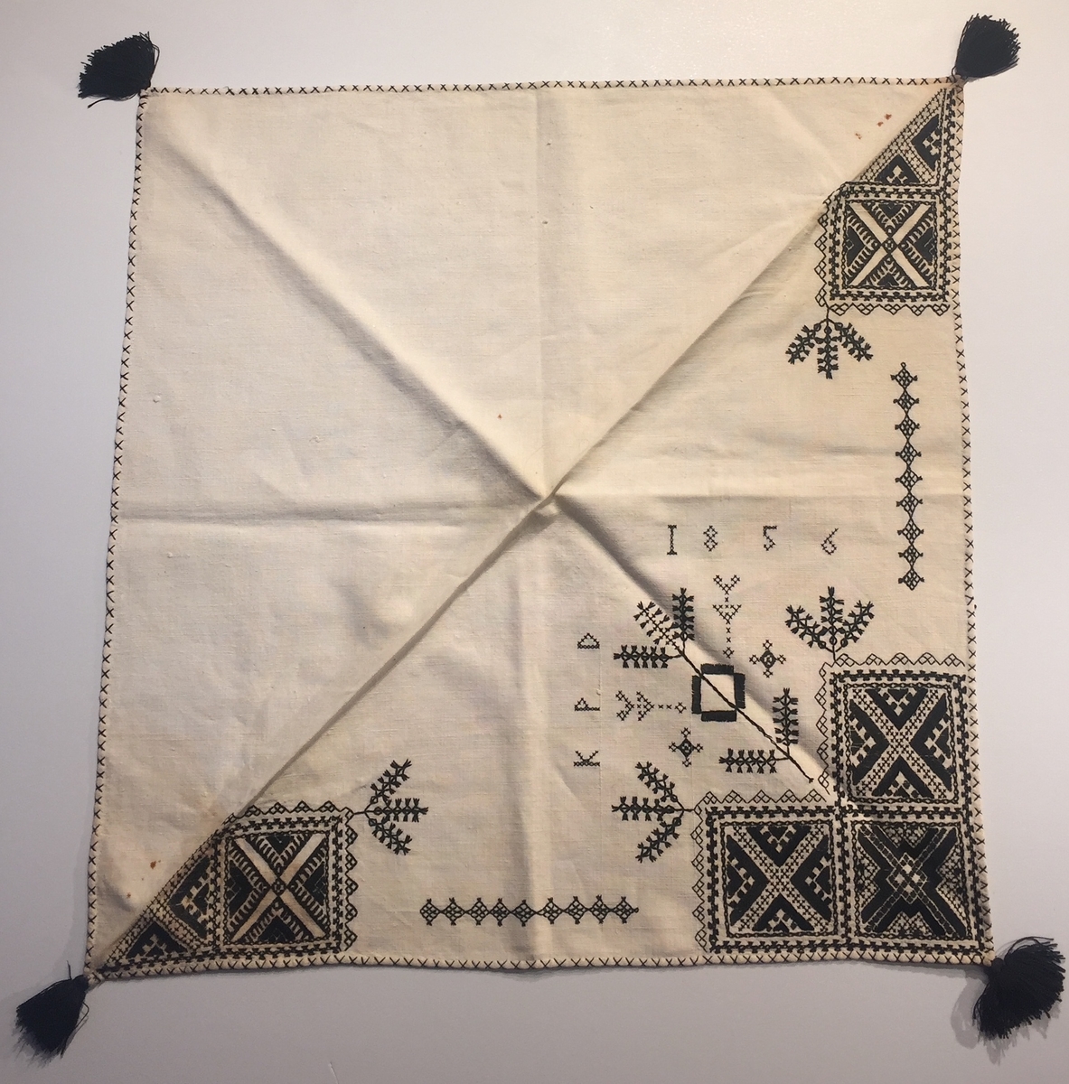 Geometriskt mönster i kvadrater i hörnen, en bård mellan kvadraterna på ryggsnibb och framsnibbar. På ryggsnibben tre kvadrater och en majstångsspira samt märkning med årtal och initialer. På varje framsnibb en kvadrat och en trekant.