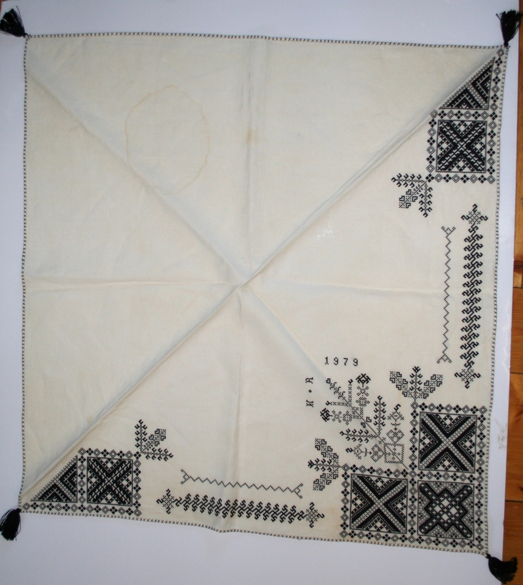 Geometriskt mönster i kvadrater i hörnen, två bårder mellan kvadraterna på ryggsnibb och framsnibbar varav en med svastikaliknande mönster. På ryggsnibben tre kvadrater och en majstångsspira samt märkning med årtal och initialer. På varje framsnibb en kvadrat och en trekant.
