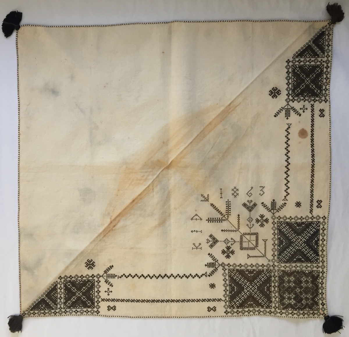 Geometriskt mönster i kvadrater i hörnen, två bårder mellan kvadraterna på ryggsnibb och framsnibbar. På ryggsnibben tre kvadrater och en majstångsspira samt märkning med årtal och initialer. På varje framsnibb en kvadrat och en trekant. Tolv ornament.