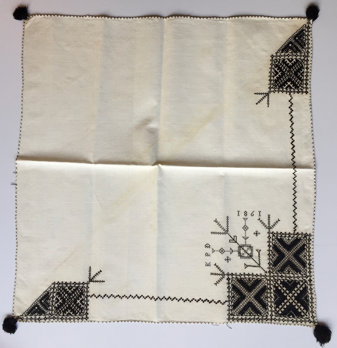 Geometriskt mönster i kvadrater i hörnen, en bård mellan kvadraterna på ryggsnibb och framsnibbar. På ryggsnibben tre kvadrater och en majstångspira samt märkning med årtal och initialer. På varje framnibb en kvadrat och en trekant. Två ornament.