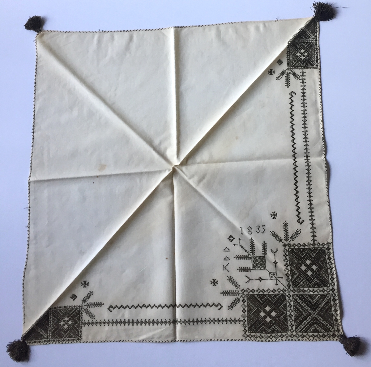 Geometriskt mönster i kvadrater i hörnen, två bårder mellan kvadraterna på ryggsnibb och framsnibbar. På ryggsnibben tre kvadrater och en majstångsspira samt märkning med årtal och initialer. På varje framsnibb en kvadrat och en trekant. Sju ornament.