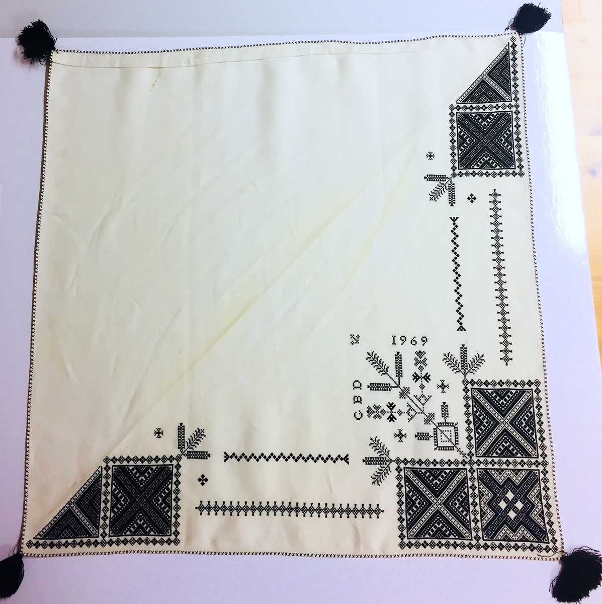 Geometriskt mönster i kvadrater i hörnen, två bårder mellan kvadraterna på ryggsnibb och framsnibbar. På ryggsnibben tre kvadrater och en majstångsspira samt märkning med årtal och initialer. På varje framsnibb en kvadrat och en trekant. Sju ornament.