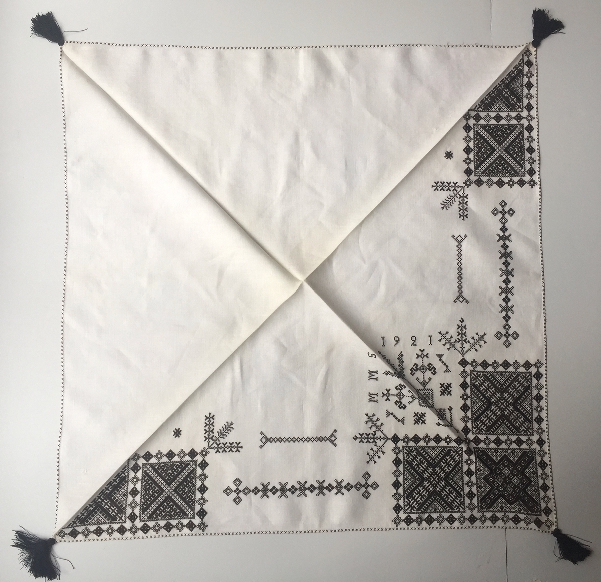 Titel: Geometriskt mönster i kvadrater i hörnen. Två bårder mellan kvadraterna på ryggsnibb och framsnibbar. På ryggsnibben tre kvadrater och en majstångsspira samt märkning med årtal och initialer. På varje framsnibb en kvadrat och en trekant. Sex ornament