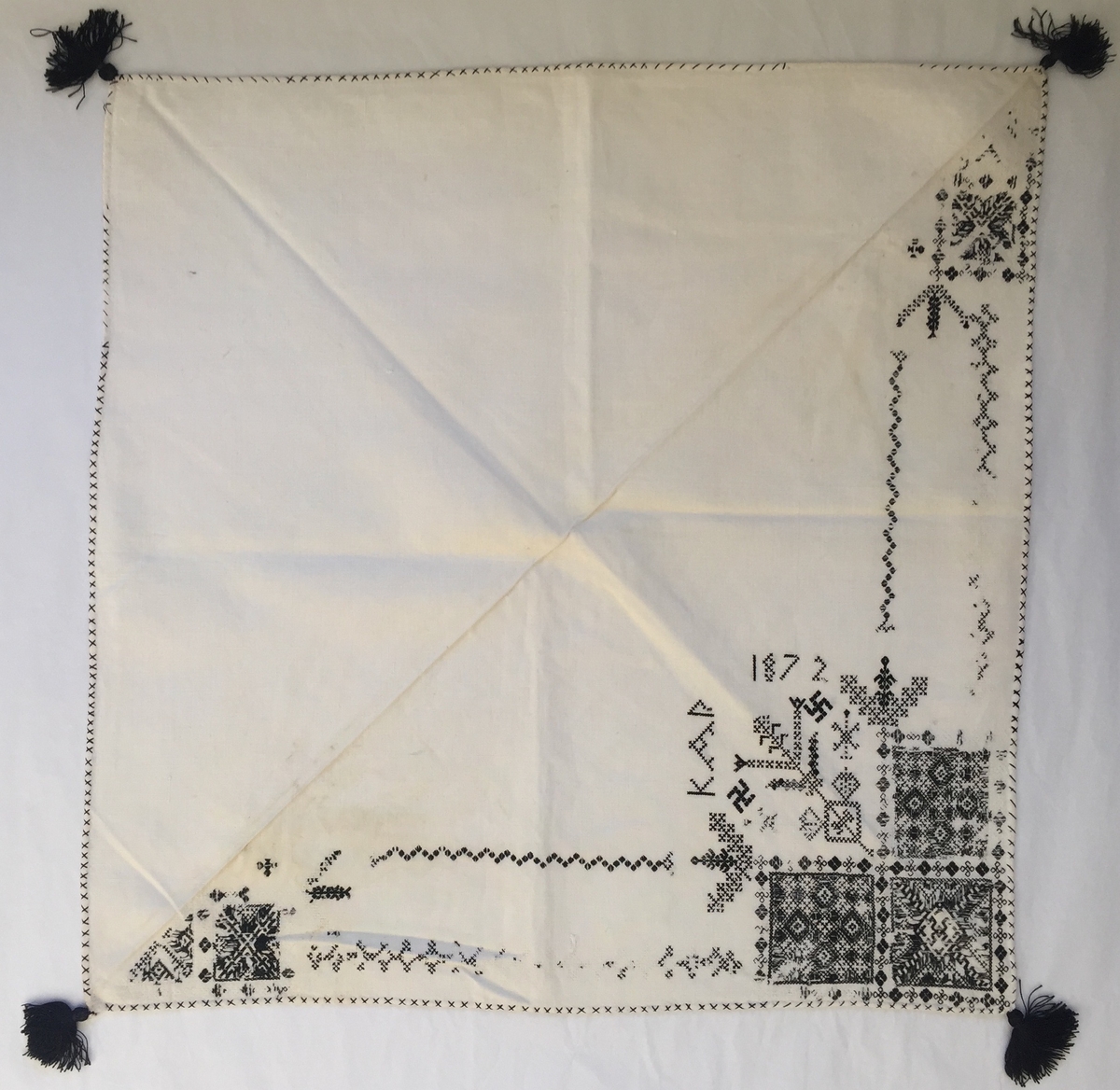 Geometriskt mönster i kvadrater i hörnen, två bårder mellan kvadraterna på ryggsnibb och framsnibbarna. På ryggsnibben tre kvadrater och en majstångsspira samt märkning med årtal och initialer. På varje framsnibb en kvadrat och en trekant. Fyra ornament.