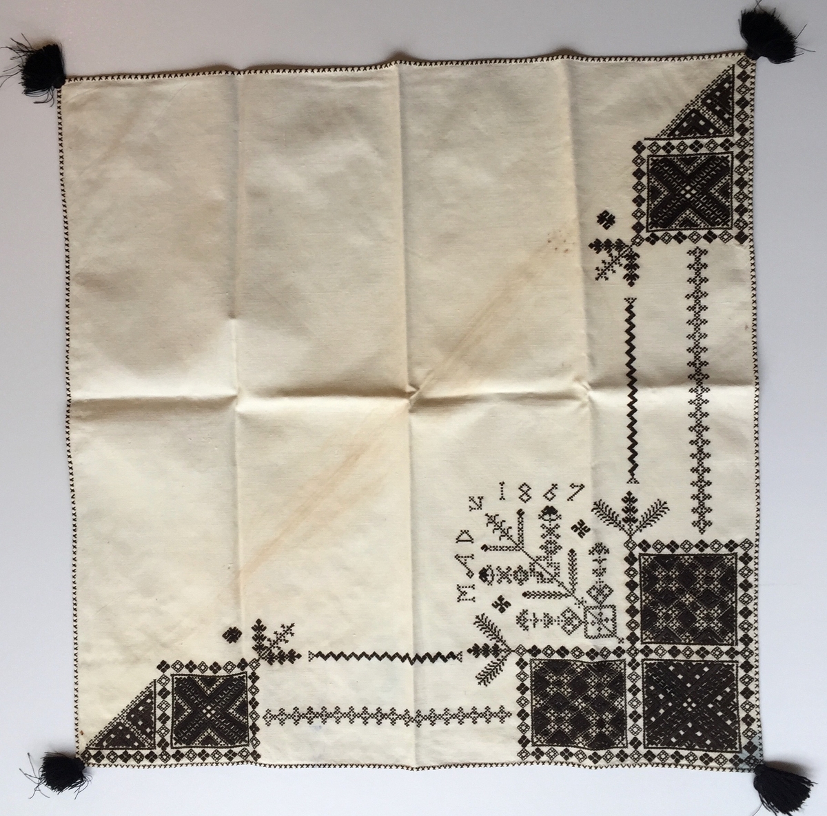 Geometriska mönster i kvadrater i hörnen, två bårder mellan kvadraterna på ryggsnibb och framsnibbar. På ryggsnibben tre kvadrater och en majstångsspira sasmt märkning med årtal och initialer. På varje framsnibb en kvadrat och en trekant. Fyra ornament.