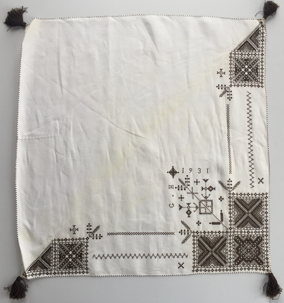 Geometriskt mönster i kvadrater i hörnen. Två bårder mellan kvadraterna på ryggsnibb och framsnibbar. På ryggsnibben tre kvadrater och en majstångsspira samt märkning med årtal och initialer. På varje framsnibb en kvadrat och en trekant. Nio ornament.