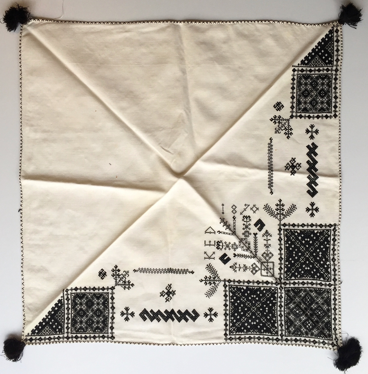 Geometriskt mönster i kvadrater i hörnen, två bårder mellan kvadraterna på ryggsnibb och framsnibbar. På ryggsnibben tre kvadrater och en majstångssspira samt märkning med årtal och initialer. På varje framsnibb en kvadrat och en trekant. Sex ornament.