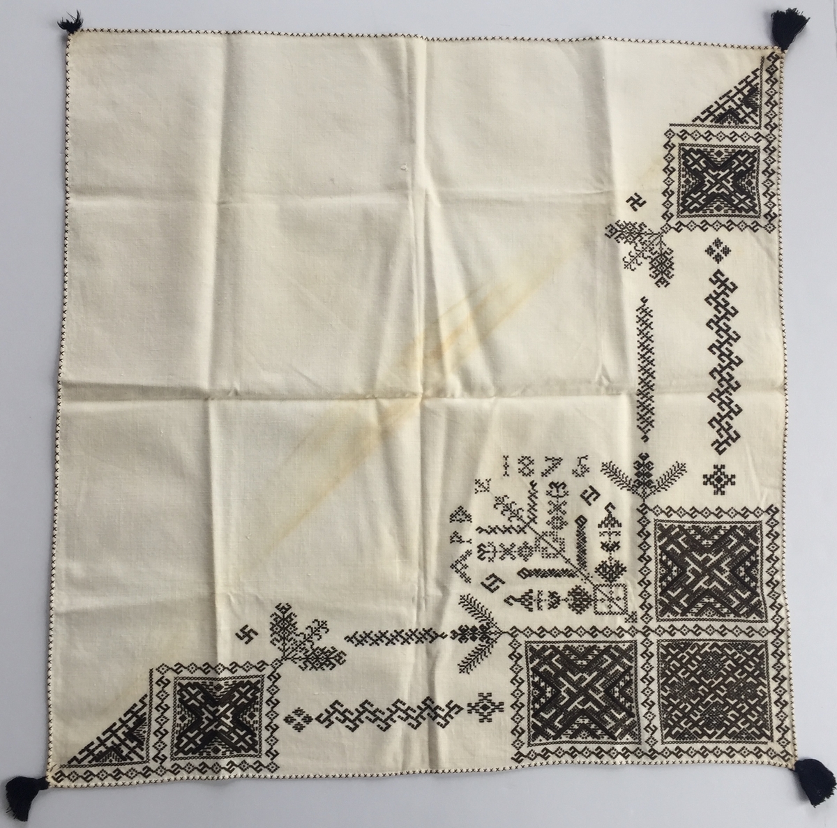 Geometriskt mönster i huvudsak i rätlinjig plattsöm i kvadrater i hörnen. Två bårder mellan kvadraterna på ryggsnibb och framsnibbar. På ryggsnibben tre kvadrater och en majstångsspira samt märkning med årtal och initialer. På varje framsnibb en kvadrat och en trekant. Åtta ornament.