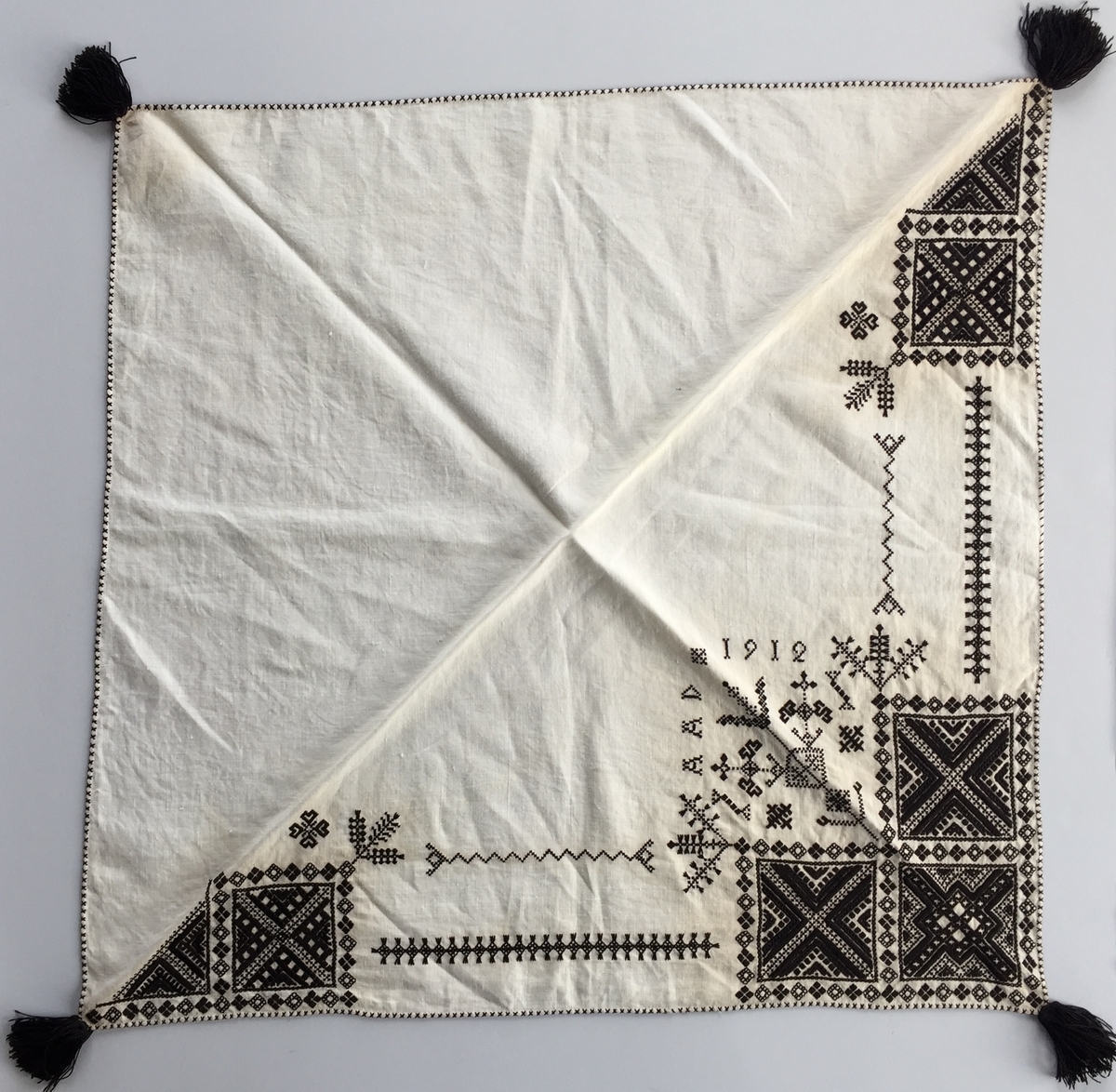 Geometriskt mönster i kvadrater i hörnen. Två bårder mellan kvadraterna på ryggsnibb och framsnibbar. På ryggsnibben tre kvadrater och en majstångsspira samt märkning med årtal och initialer. På varje framsnibb en kvadrat och en trekant. Sju ornament.