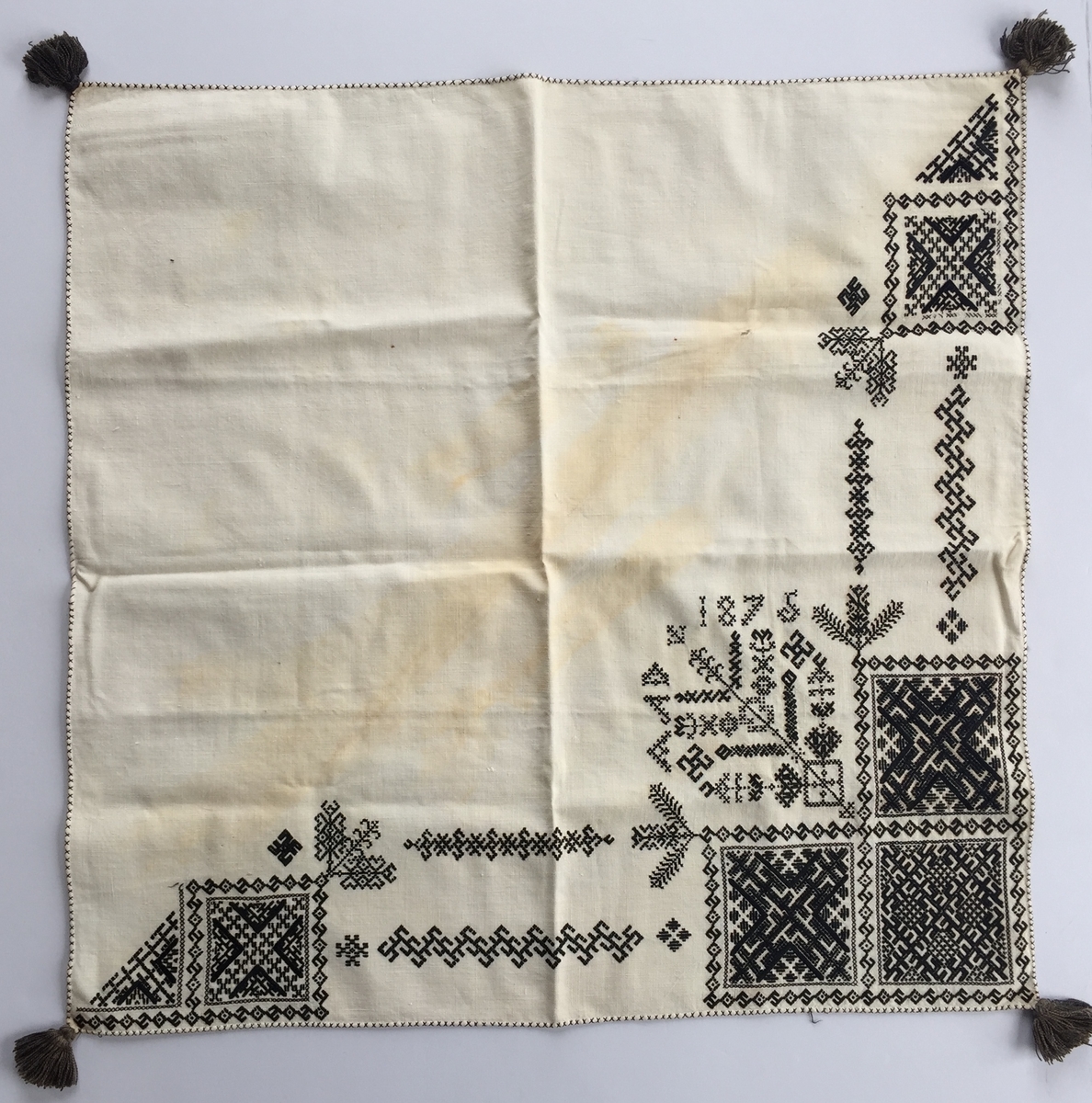 Geometriskt mönster i huvudsak i rätlinjig plattsöm i kvadrater i hörnen. Två bårder mellan kvadraterna på ryggsnibb och framsnibbar. På ryggsnibben tre kvadrater och en majstångsspira samt märkning med årtal och initialer. På varje framsnibb en kvadrat och en trekant. Sex ornament.