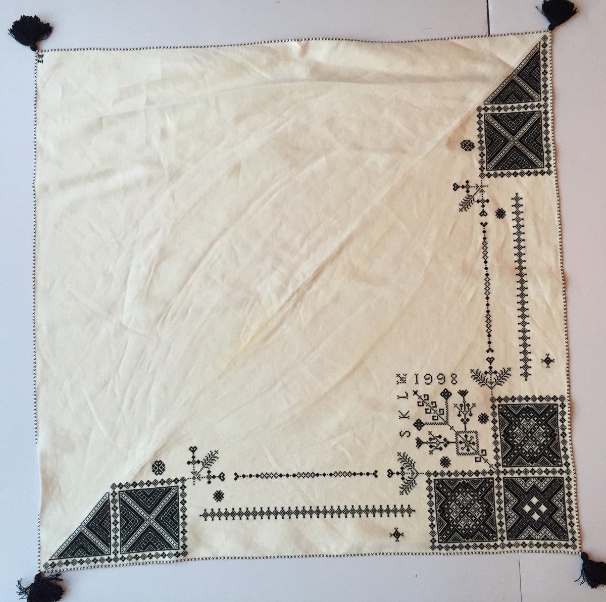 Geometriskt mönster i kvadrater i hörnen. Två bårder mellan kvadraterna på ryggsnibb och framsnibbar. På ryggsnibben tre kvadrater och en majstångsspira samt märkning med årtal och initialer. På varje framsnibb en kvadrat och en trekant. Nio ornament.