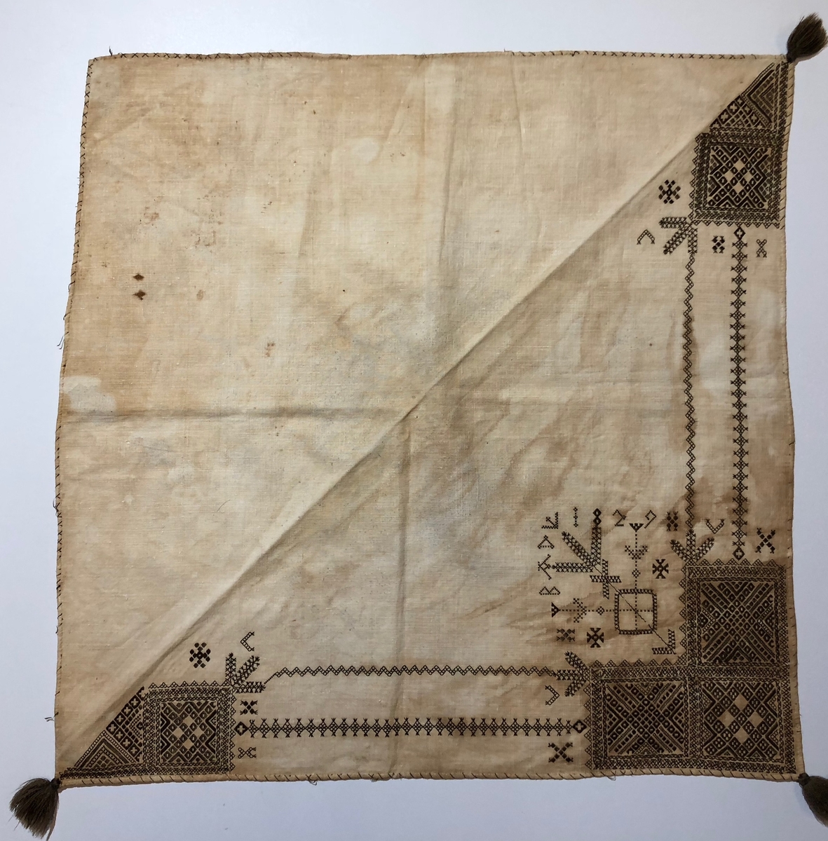 Geometriskt mönster i kvadrater i hörnen. Två bårder mellan kvadraterna på ryggsnibb och framsnibbar. På ryggsnibben tre kvadrater och en majstångsspira samt märkning med årtal och initialer. På varje framsnibb en kvadrat och en trekant. Sjutton ornament