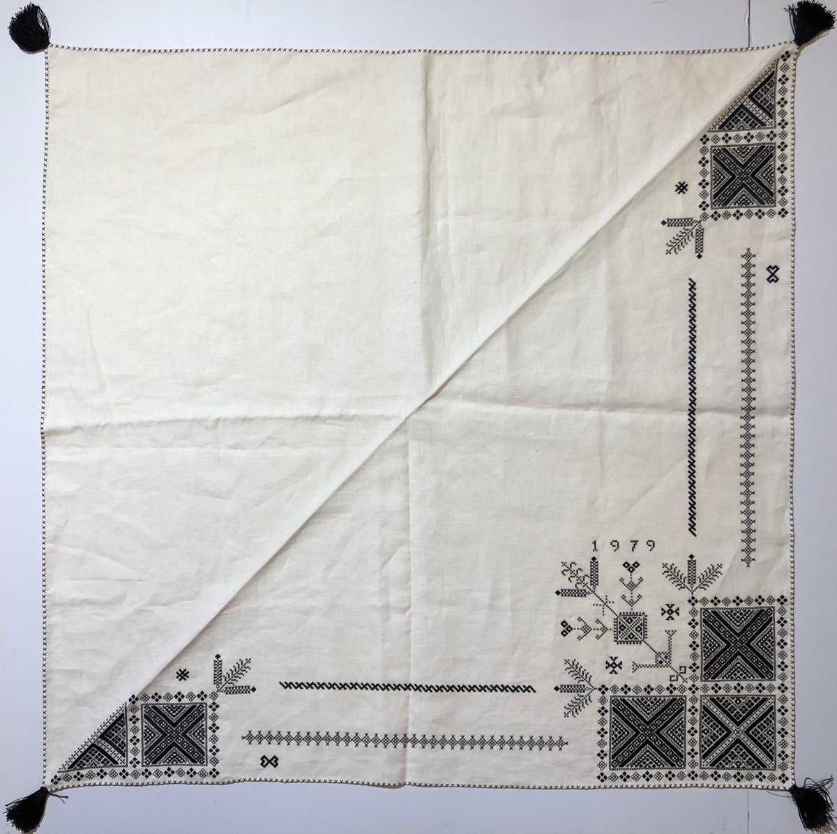 Geometriskt mönster i kvadrater i hörnen. Två bårder mellan kvadraterna på ryggsnibb och framsnibbar. På ryggsnibben tre kvadrater och en majstångsspira samt märkning med årtal. På varje framsnibb en kvadrat och en trekant. Sex ornament