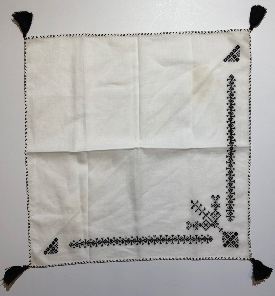 Halsklädet har ett enkelt broderi med en bård mellan ryggsnibb och framsnibbar. På ryggsnibben finns en fyrkant och en enkel dekoration. På framsnibbarna en halv fyrkant.