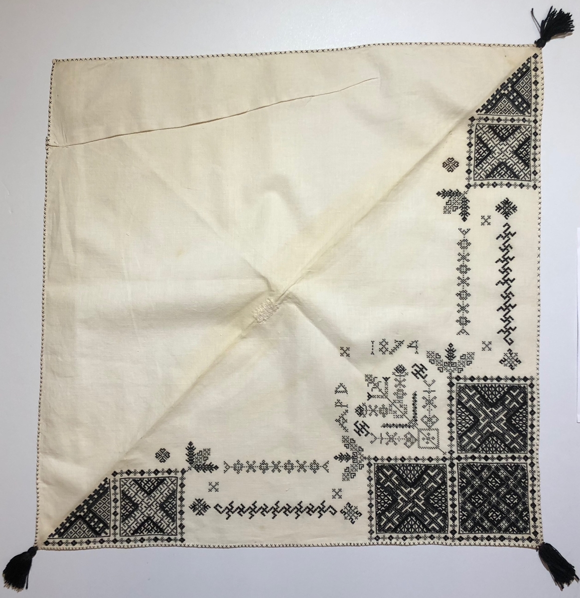 Geometriskt mönster i huvdsak i rätlinjig plattsöm i kvadrater i hörnen. Två bårder mellan kvadraterna på ryggsnibb och framsnibbar. På ryggsnibben tre kvadrater och en dekorerad majstångsspira samt märkning med årtal och initialer. På varje framsnibb en kvadrat och en trekant. Nio ornament