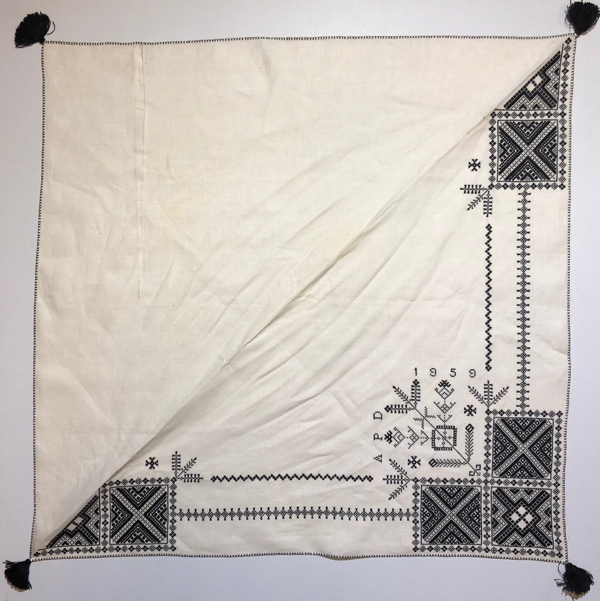 Geometriskt mönster i kvadrater i hörnen. Två bårder mellan kvadraterna på ryggsnibb och framsnibbar. På ryggsnibben tre kvadrater och en majstångsspira samt märkning med årtal och initialer. På varje framsnibb en kvadrat och en trekant. Fyra ornament