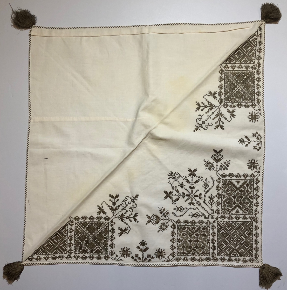Blomsterinspirerat mönster i kvadrater i hörnen. Runt kvadraterna bård i blomstermotiv. Mellan kvadraterna på ryggsnibb och framsnibbar blomstermotiv. På ryggsnibben tre kvadrater och en blomsterdekoration. På varje framsnibb en kvadrat och en trekant.
