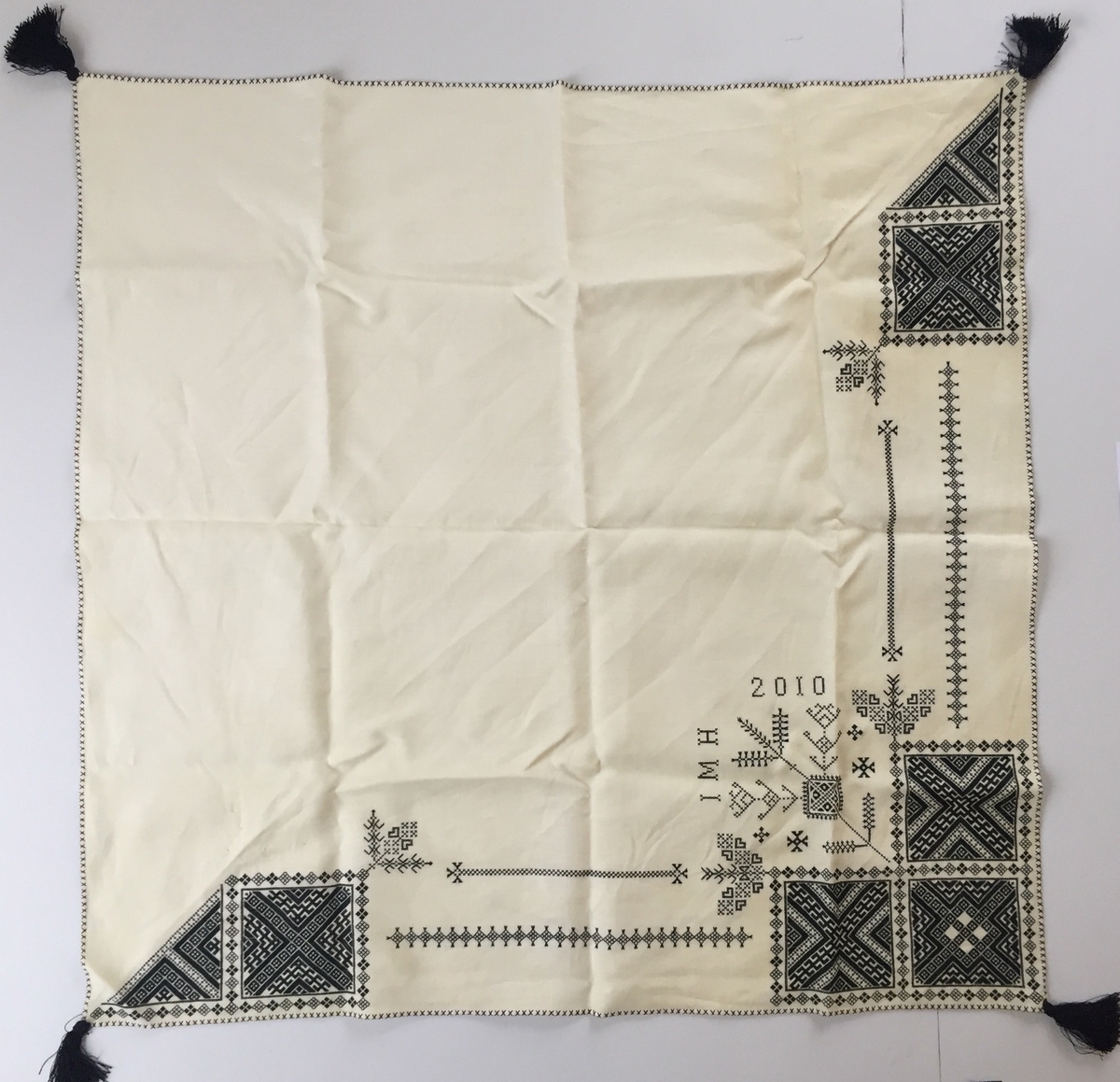 Geometriskt mönster i kvadrater i hörnen huvudsakligen i rätlinjig plattsöm. Två bårder mellan kvadraterna på ryggsnibb och framsnibbar. På ryggsnibben tre kvadrater och en majstångsspira samt märkning med årtal och initialer. På varje framsnibb en kvadrat och en trekant. Fyra ornament.