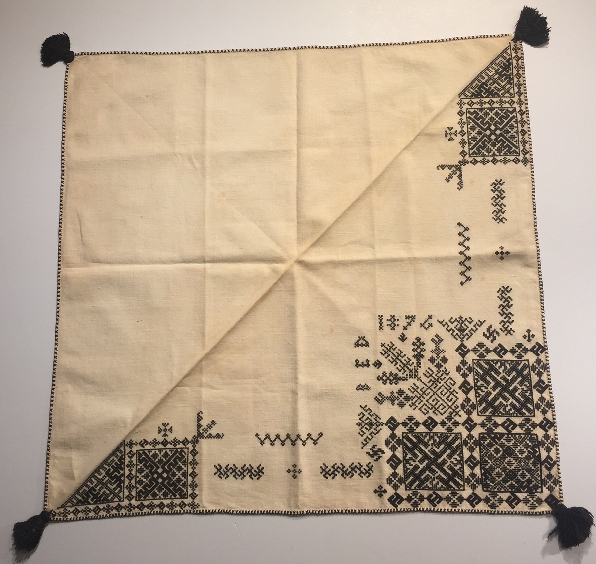 Geometriskt mönster i kvadrater i hörnen, två bårder mellan kvadraterna på ryggsnibb och framsnibbar,varav en delad. På ryggsnibben tre kvadrater och en kraftig majstångsspira samt märkning med årtal och initialer. På varje framsnibb en kvadrat och en trekant. Åtta ornament.