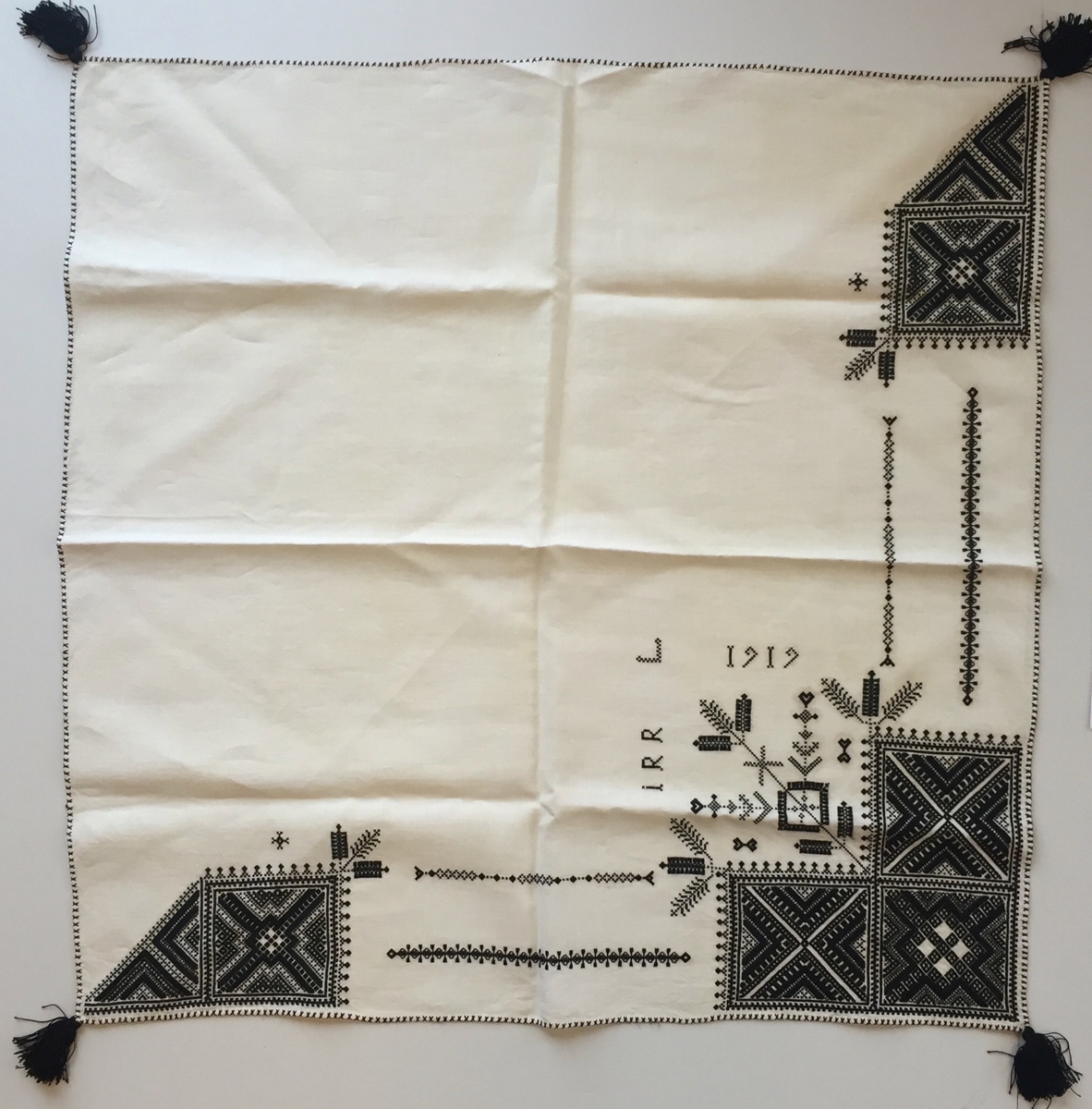 Geometriskt mönster i kvadrater i hörnen. Två bårder mellan kvadraterna på ryggsnibb och framsnibbar. På ryggsnibben tre kvadrater och en majstångsspira samt märkning med årtal och initialer. På varje framsnibb en kvadrat och en trekant. Fem ornament